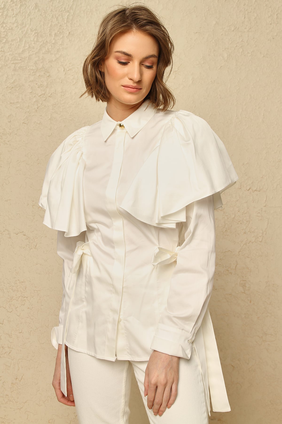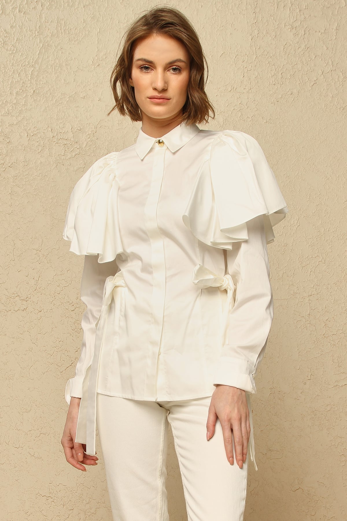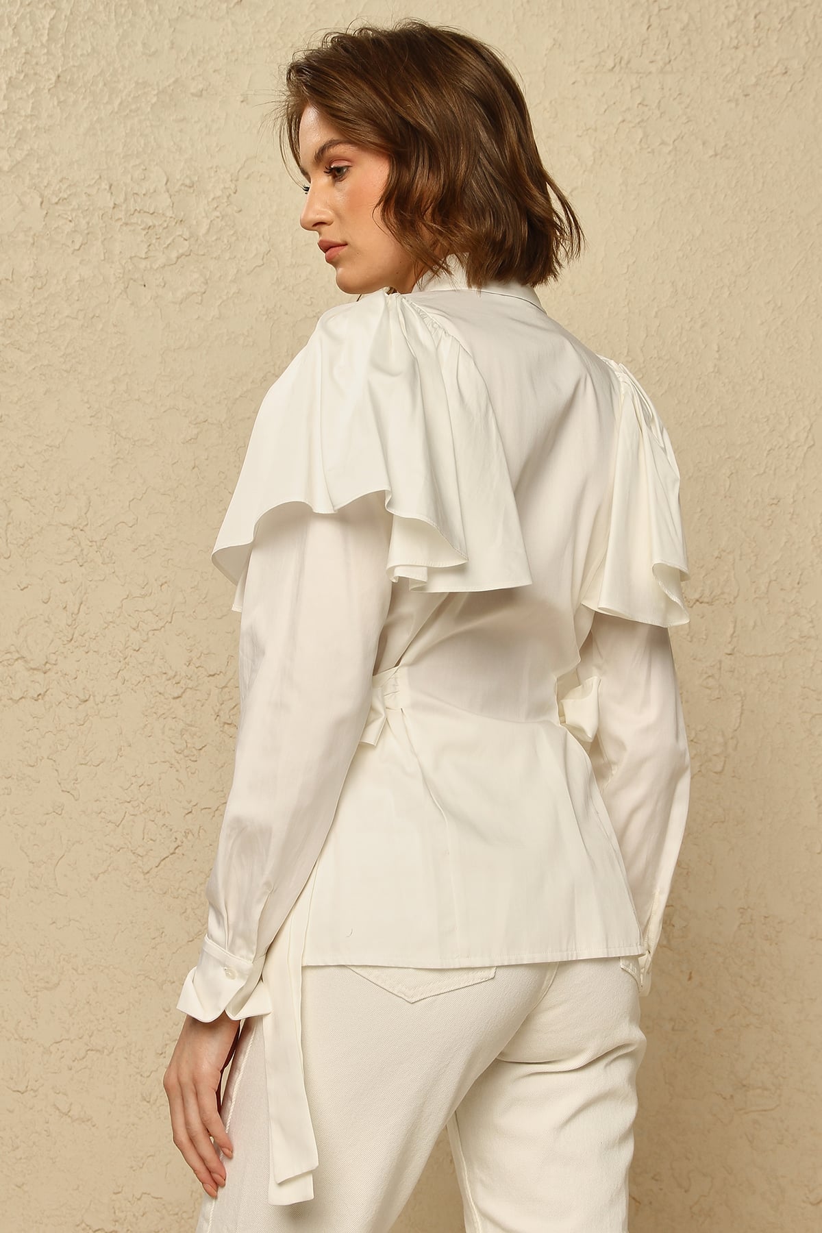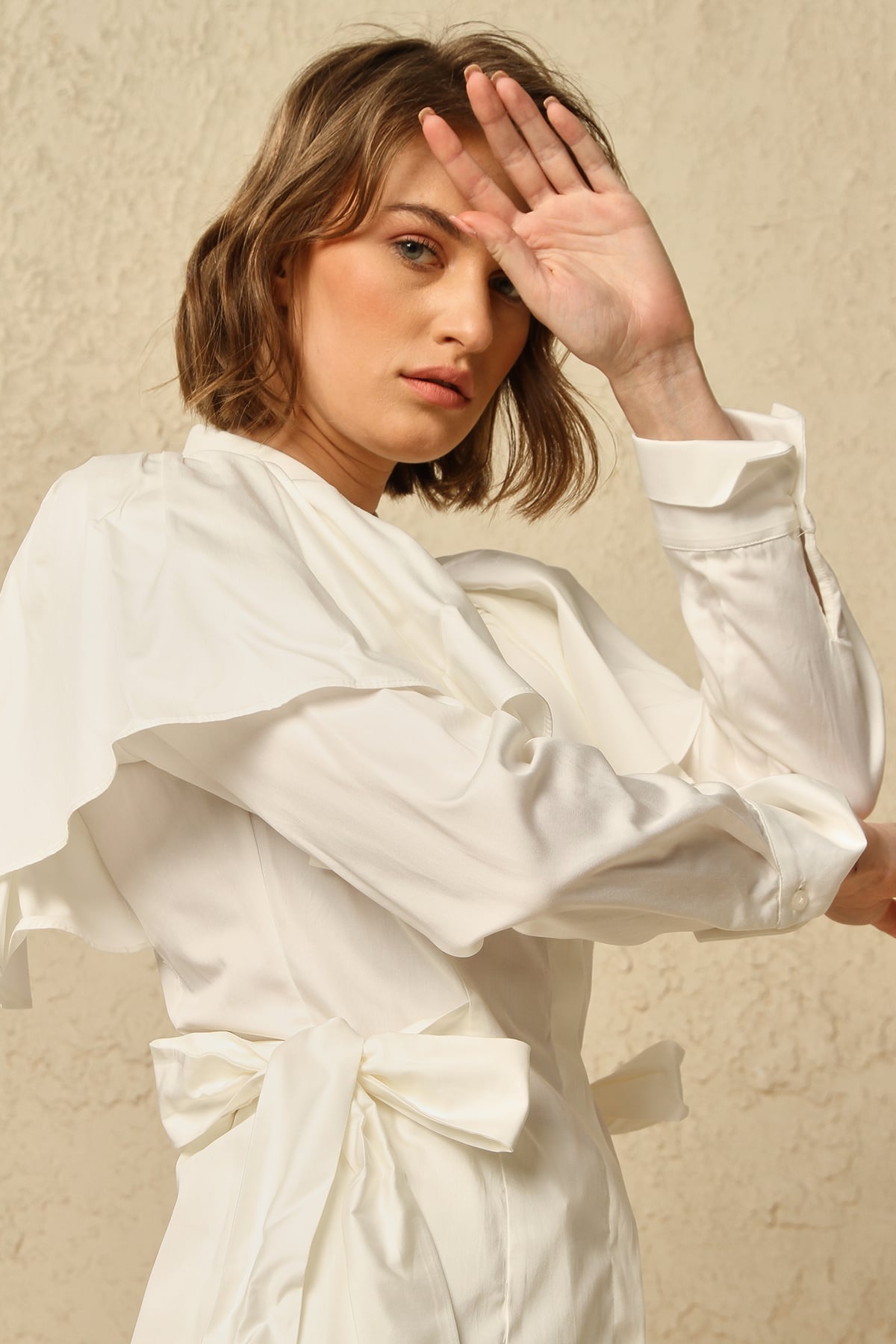 BERRENstudio kadını, şıklığıyla bağırmaz; zarafetiyle hatırlanır. Ondula Bluz, omuzlardaki volan hareketiyle dingin ama etkileyici bir siluet sunarken, beldeki kuşak detayıyla feminen gücü vurgular.