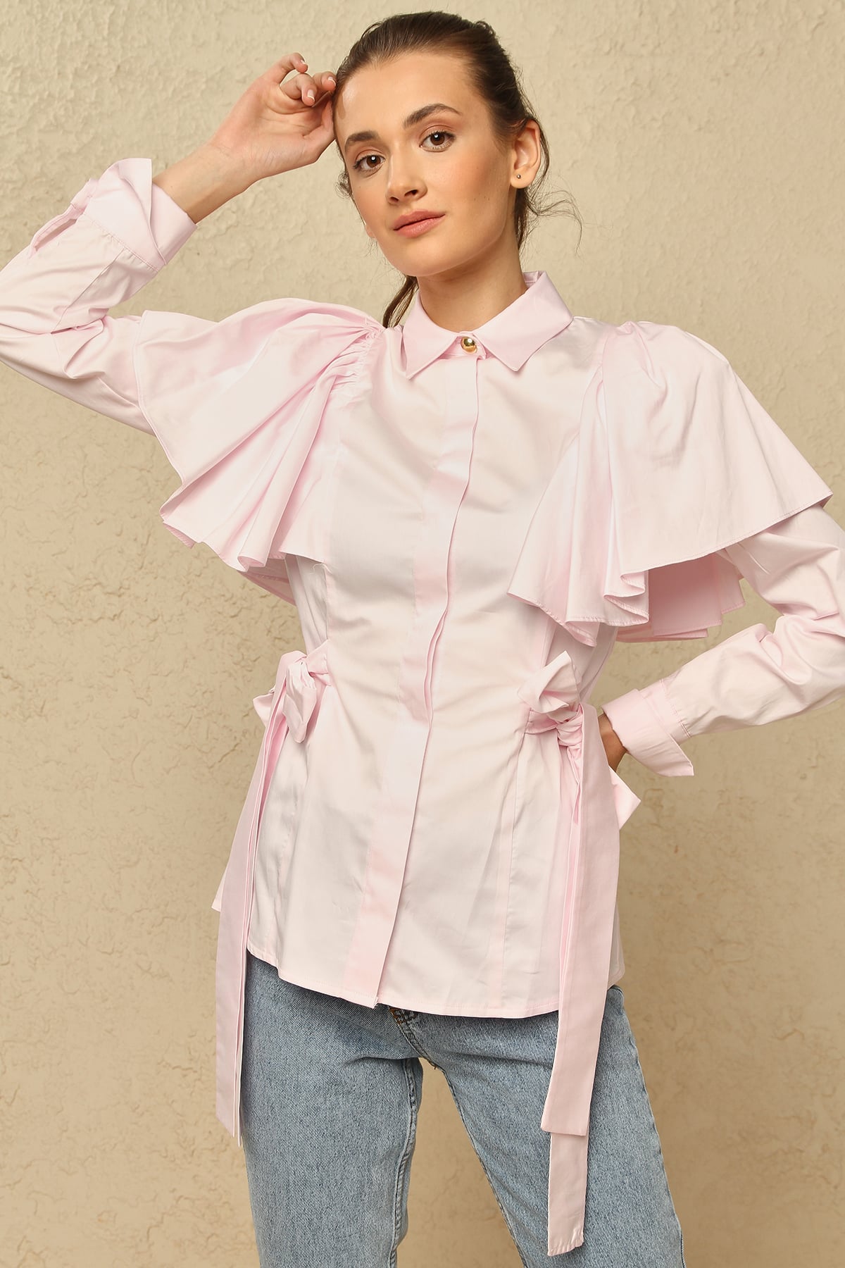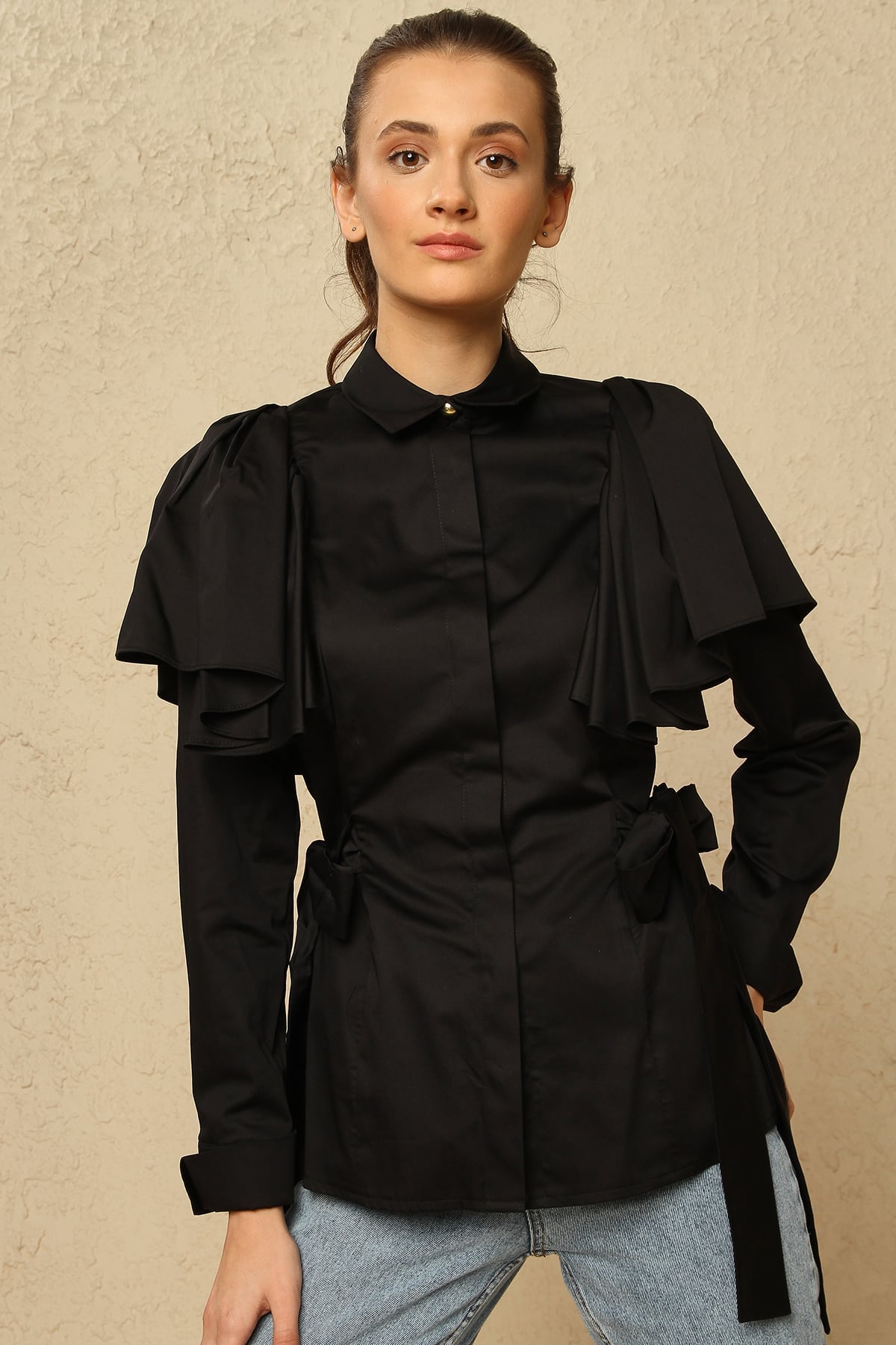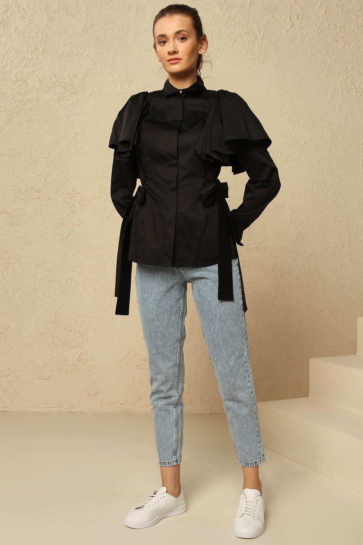 BERRENstudio kadını, şıklığıyla bağırmaz; zarafetiyle hatırlanır. Ondula Bluz, omuzlardaki volan hareketiyle dingin ama etkileyici bir siluet sunarken, beldeki kuşak detayıyla feminen gücü vurgular.