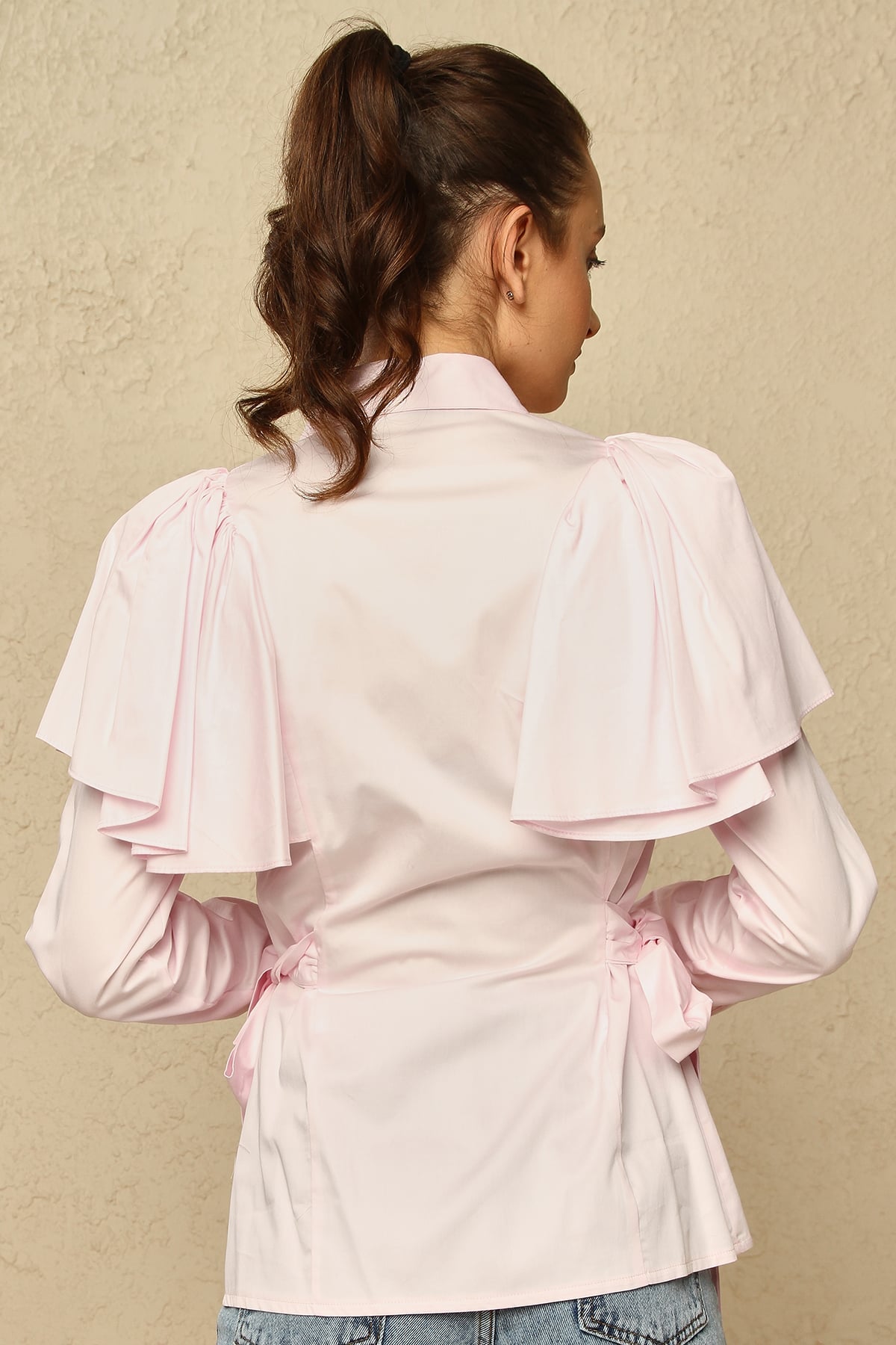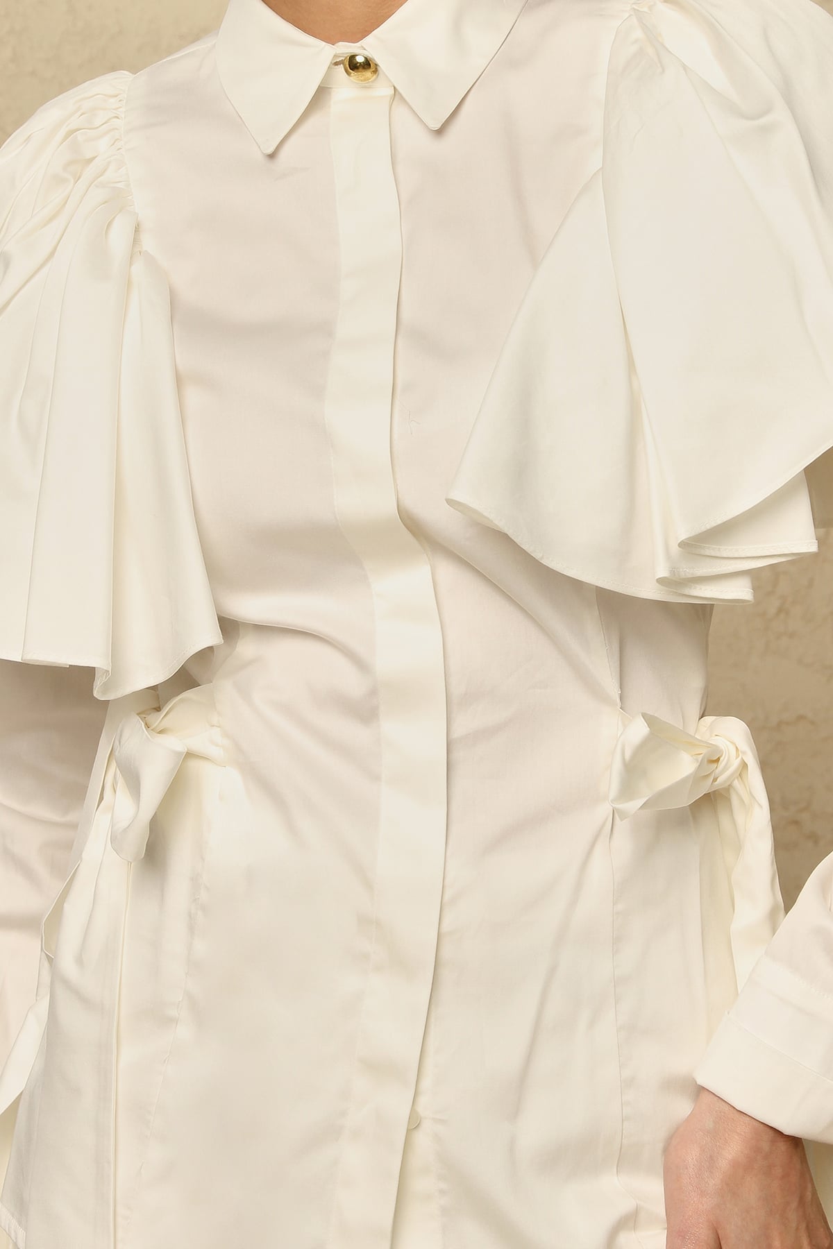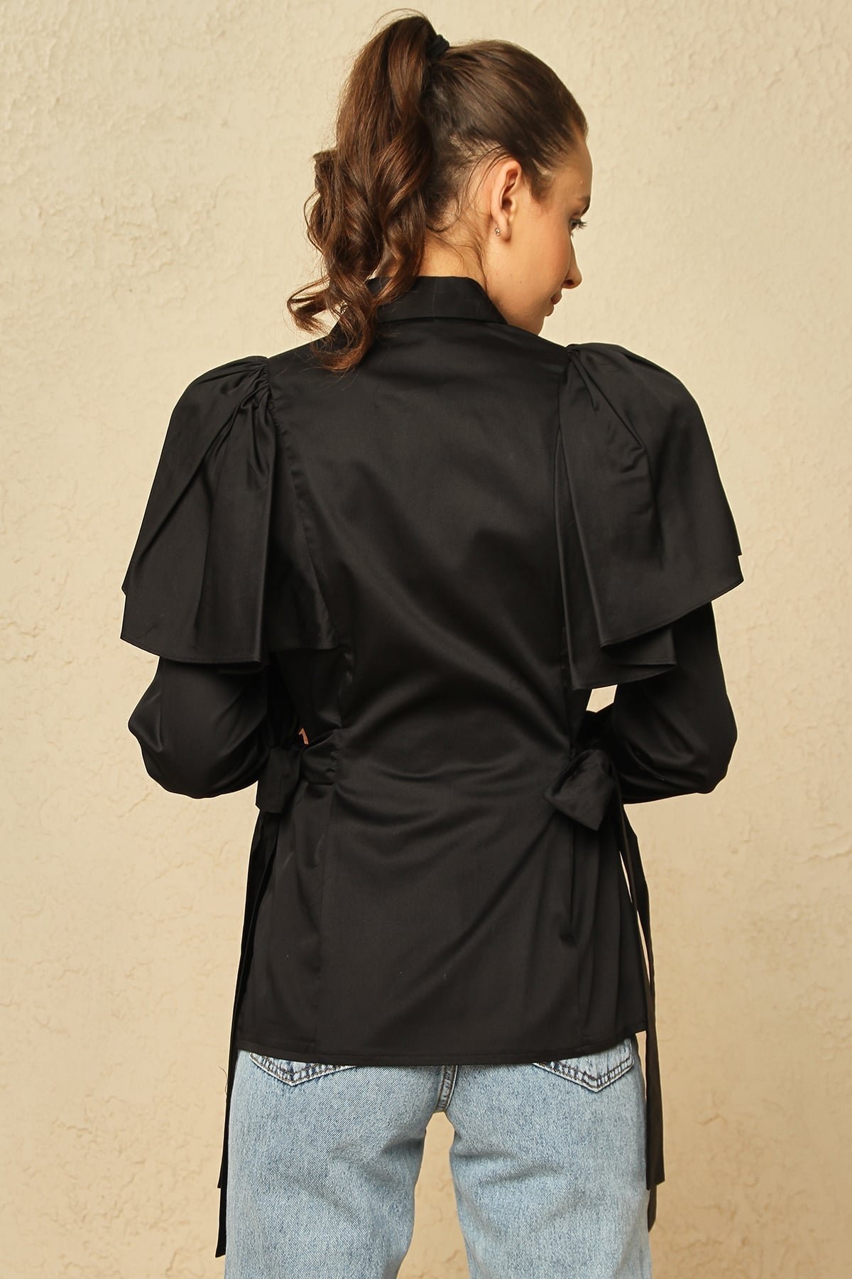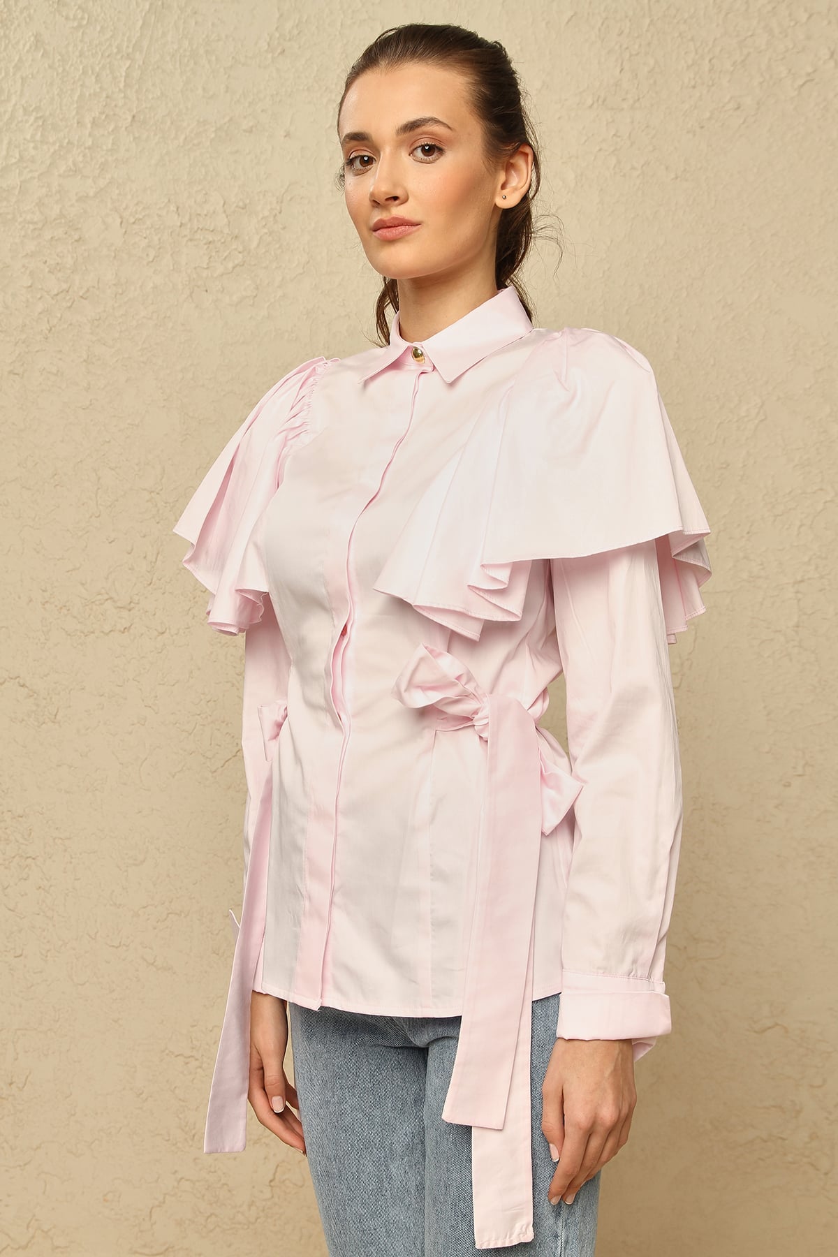 BERRENstudio kadını, şıklığıyla bağırmaz; zarafetiyle hatırlanır. Ondula Bluz, omuzlardaki volan hareketiyle dingin ama etkileyici bir siluet sunarken, beldeki kuşak detayıyla feminen gücü vurgular.
