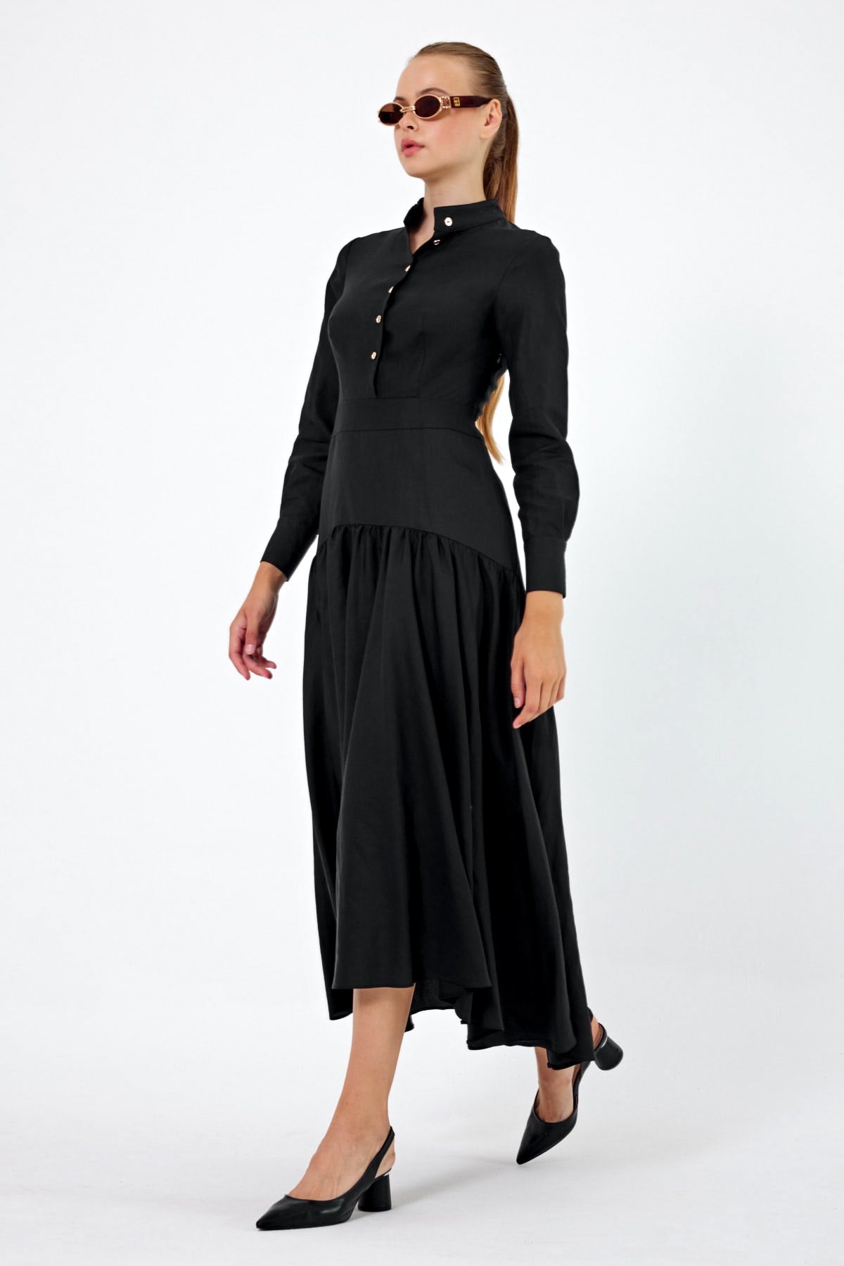Dik yakasıyla asil bir siluet yaratan bu model, sade görünümüne rağmen güçlü bir izlenim bırakır. Modern kadının mahremiyet ve özgünlük arayışına hitap eden tasarımı, hem şehir hayatında hem de özel anlarda zarif bir alternatif sunar. Hafif yapısıyla gün boyu konfor sağlayan Alice Elbise, feminen şıklığın yalın ama etkili halini üzerinizde taşımanızı sağlar.