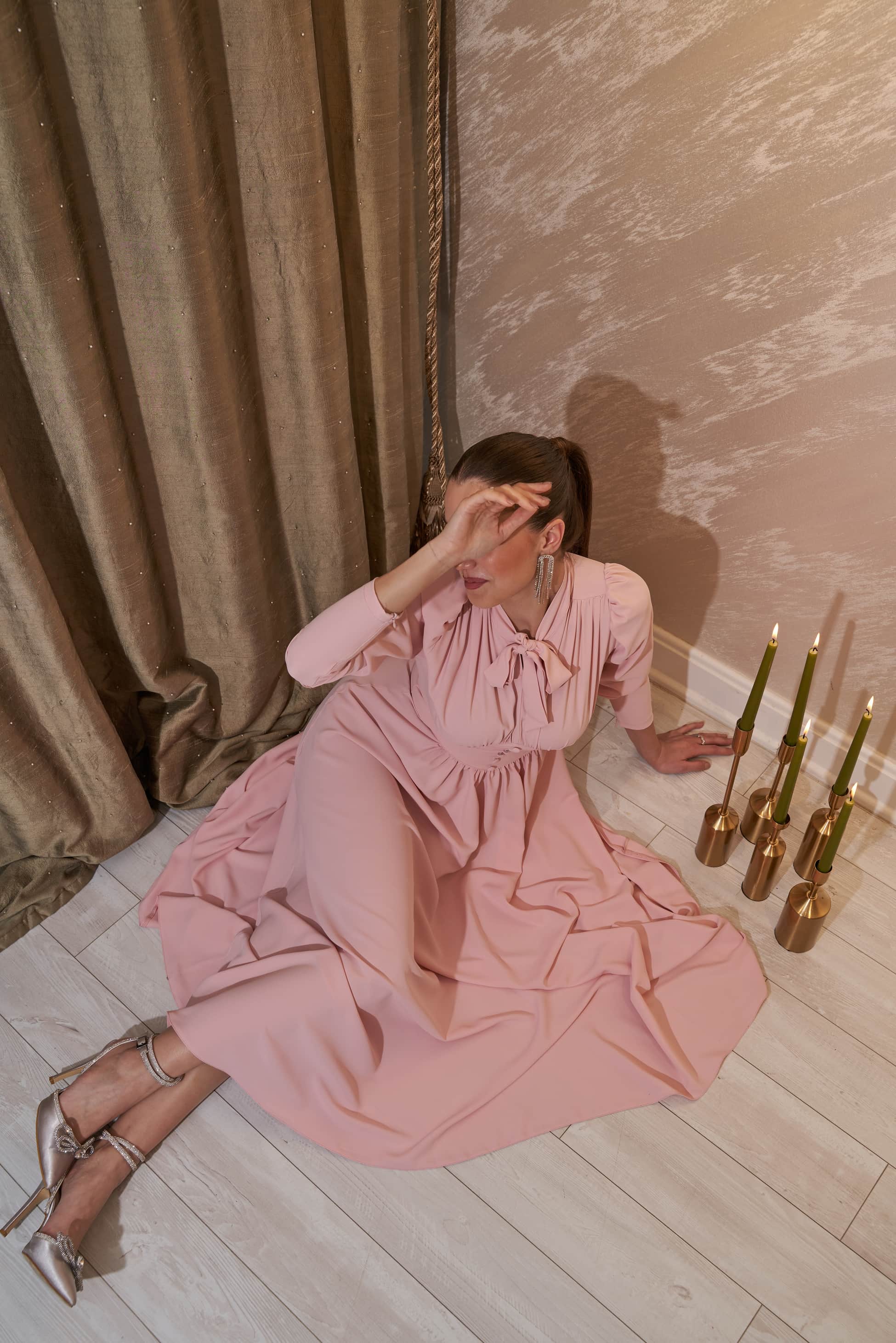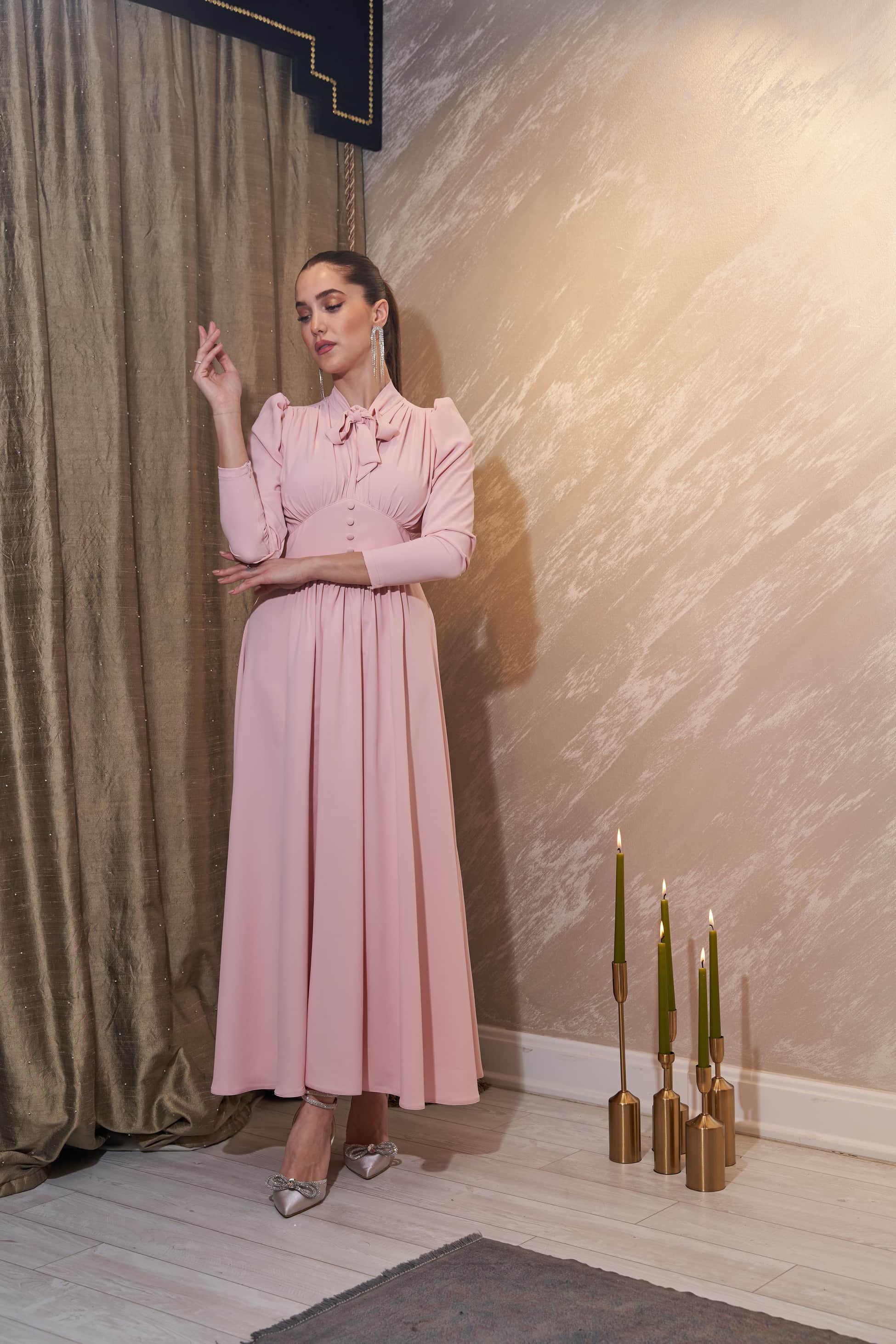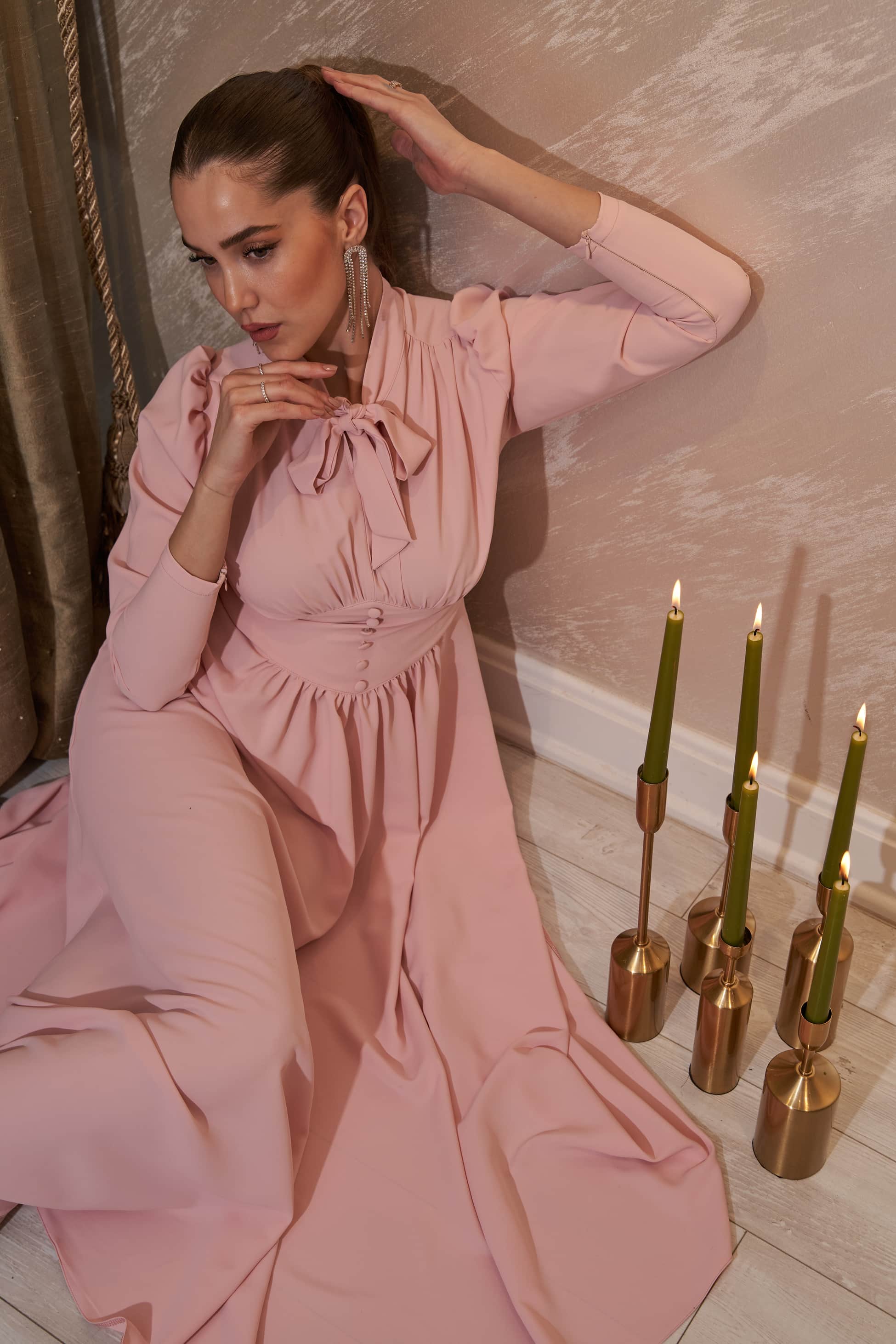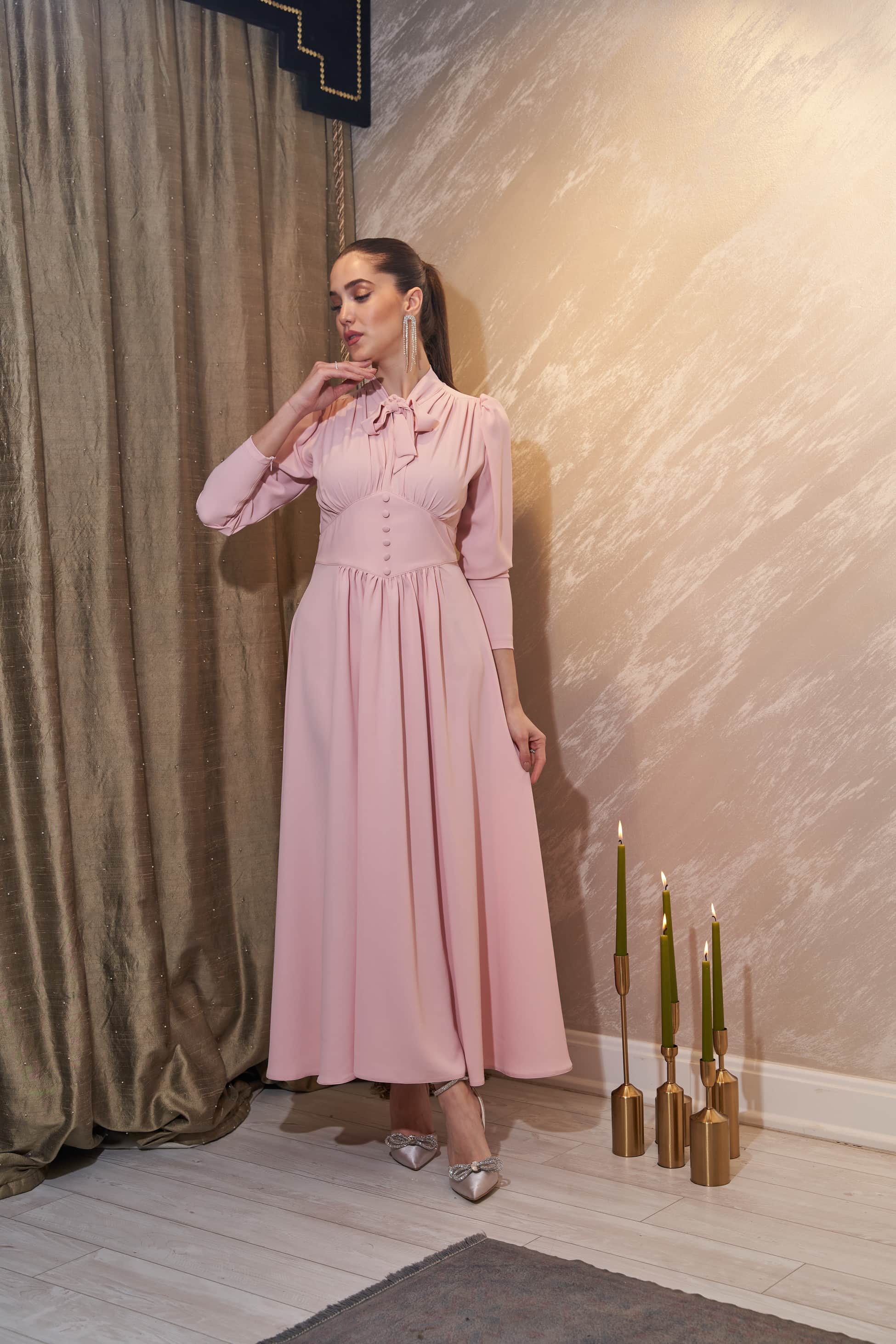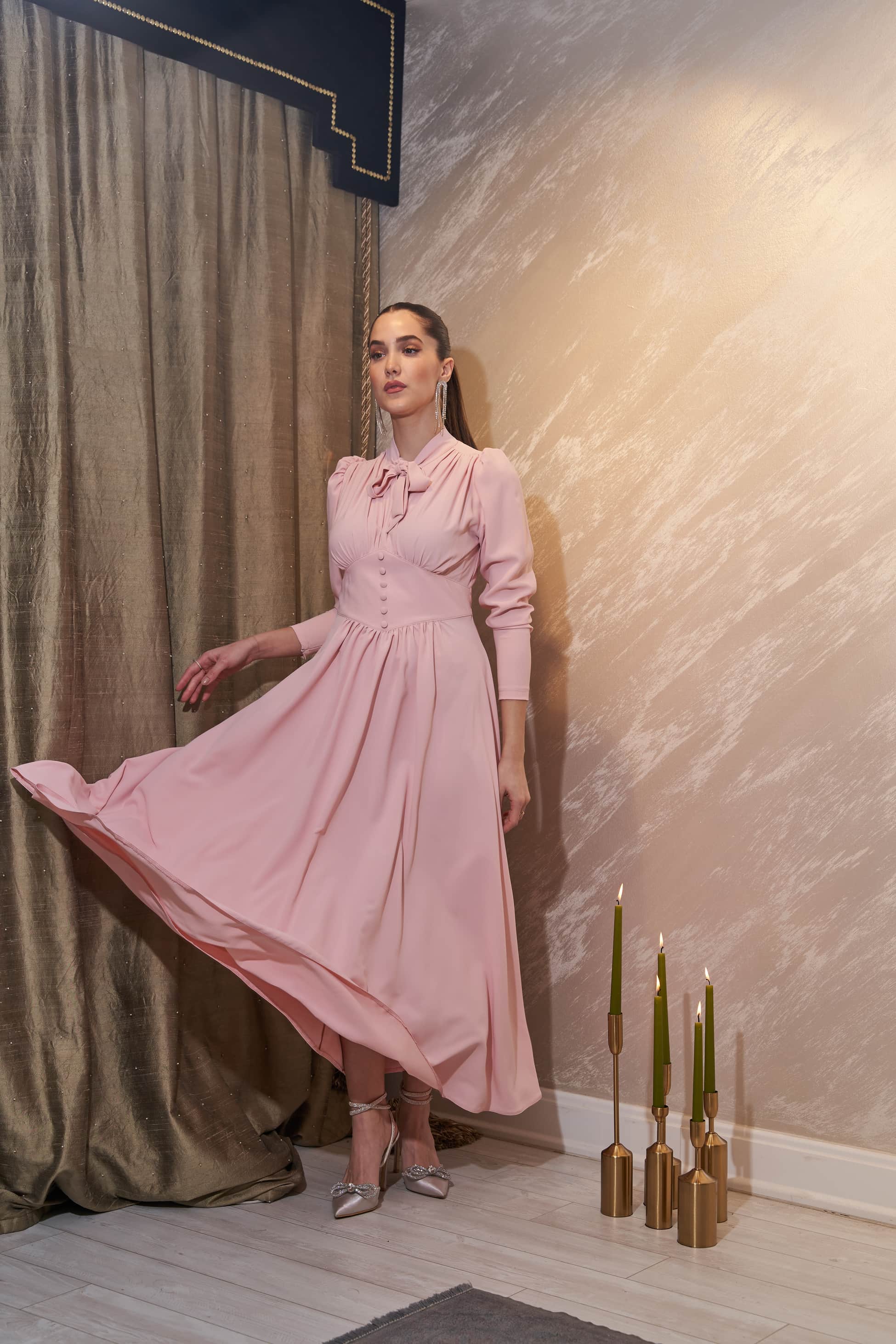 BERRENstudio'nun şıklığını ve zarafetini yansıtan Moana Elbise, her detayında lüksü ve konforu buluşturuyor. Önündeki düğme ve bağlama detayı, elbiseye sofistike bir hava katarken, pileli kloş eteği her adımda zarif bir hareket sağlar.