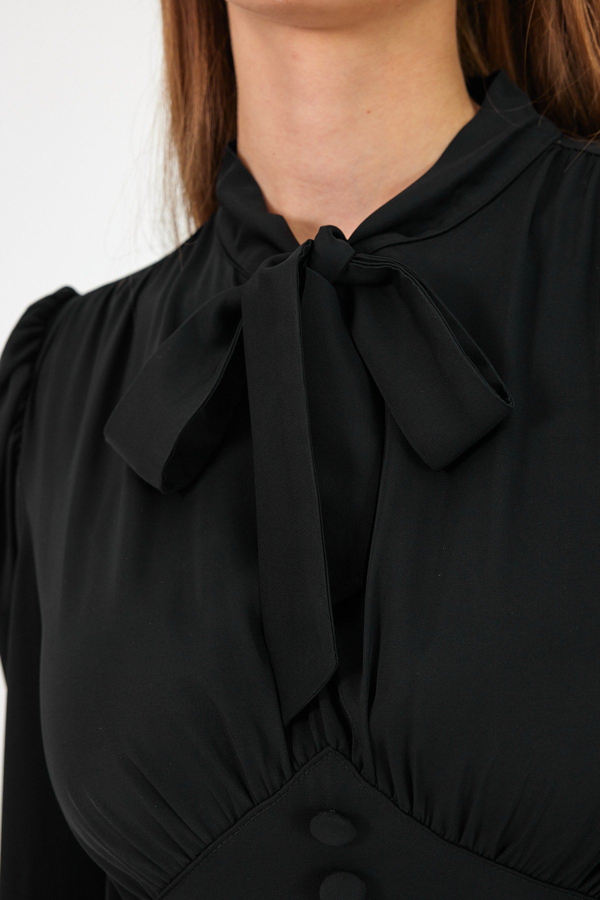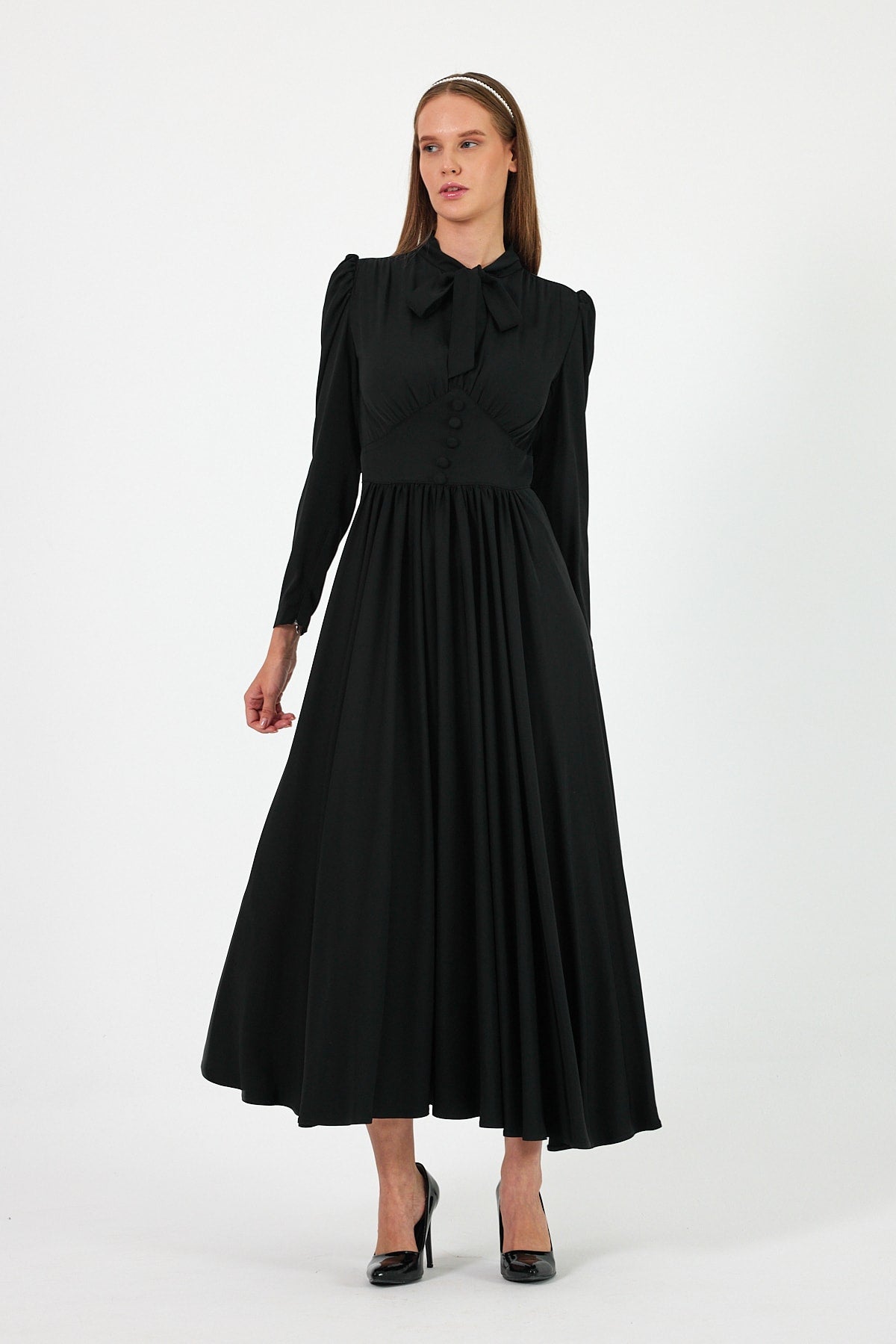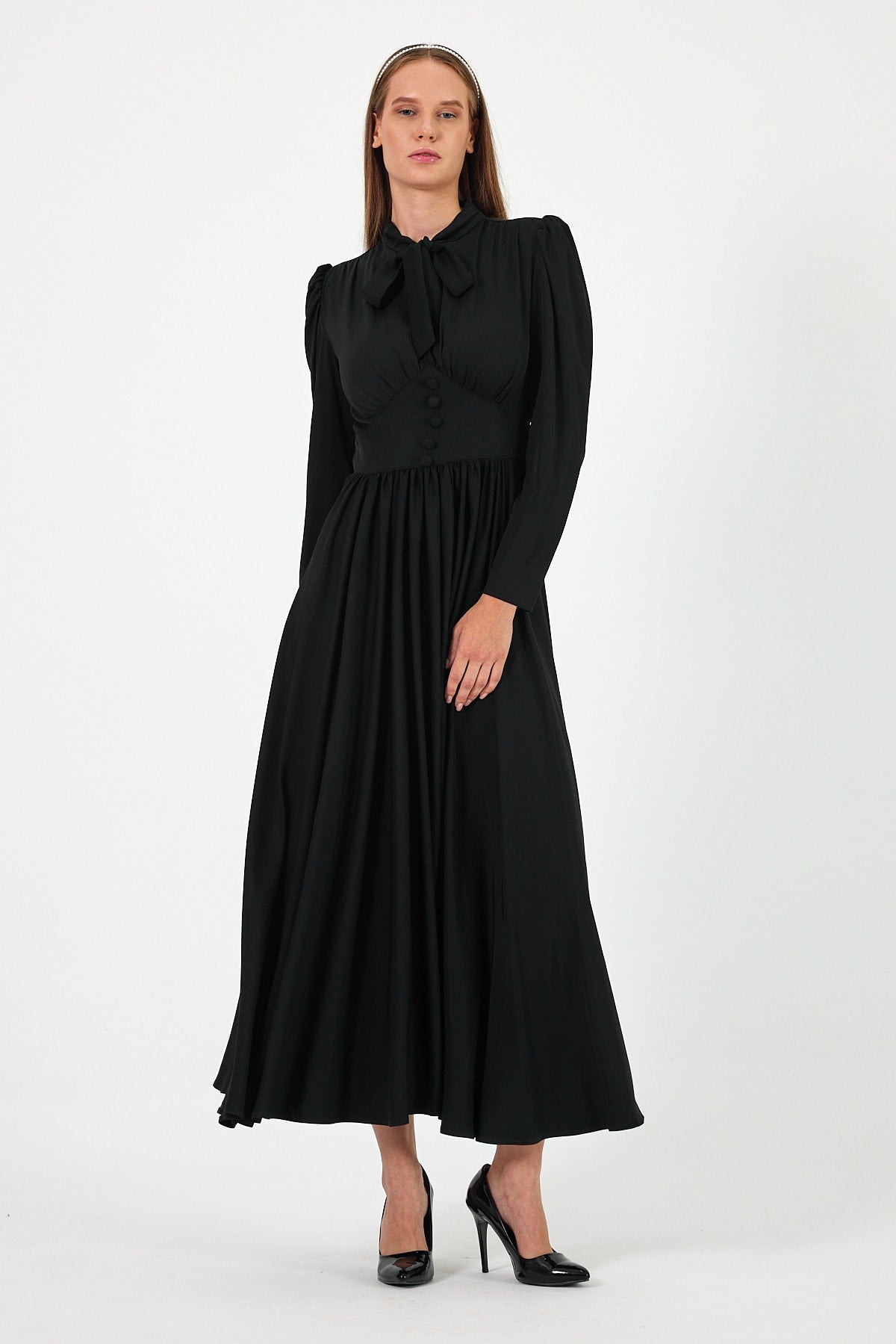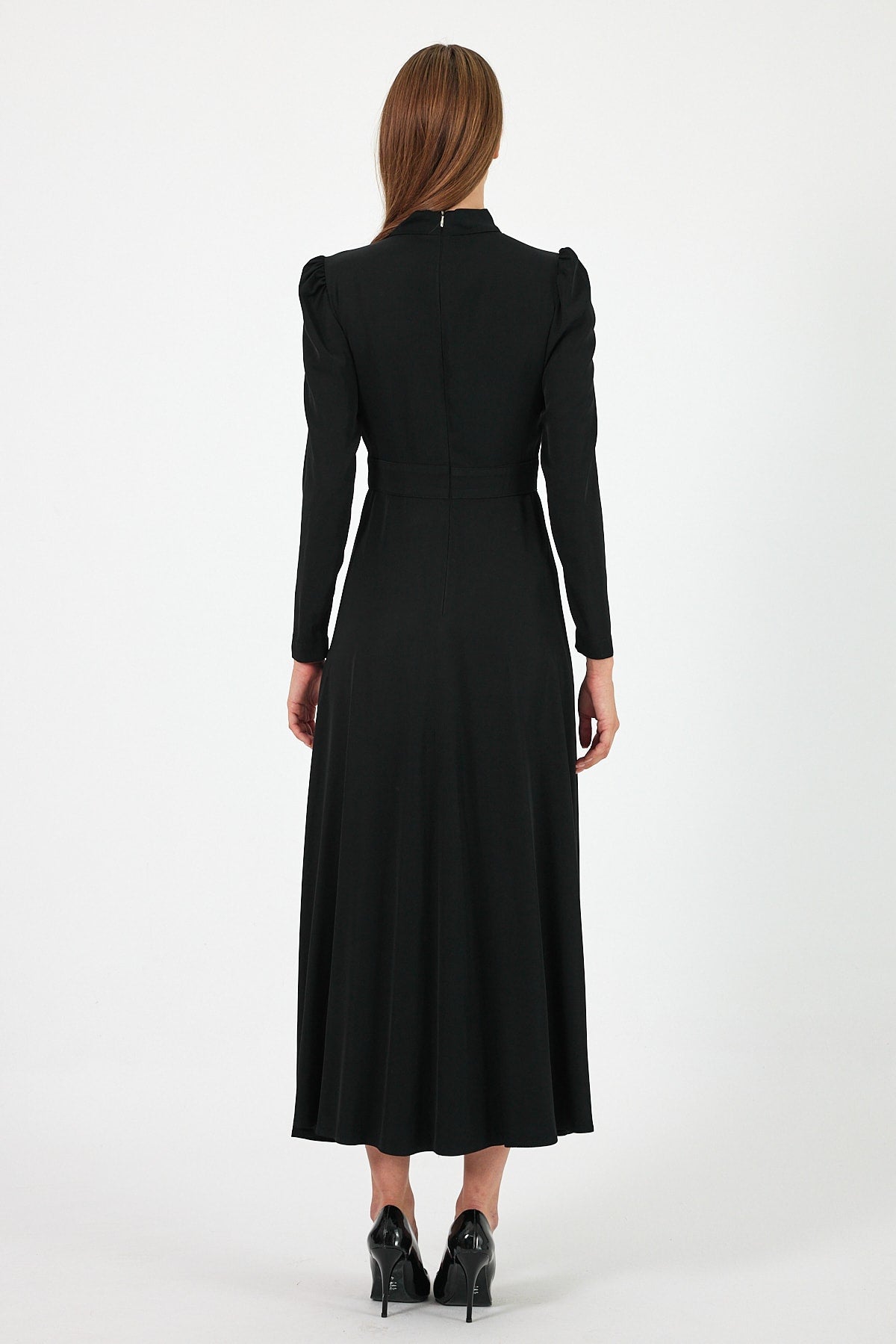 Polyester kumaşın kaliteli yapısı, elbiseye dayanıklılık ve rahatlık katarken, iç göstermez özelliğiyle şıklığınızı güvenle sergileyebilirsiniz. Bilek boyu tasarımı ve akıcı kesimi, modern bir siluet oluşturur ve her ortama uyum sağlar.