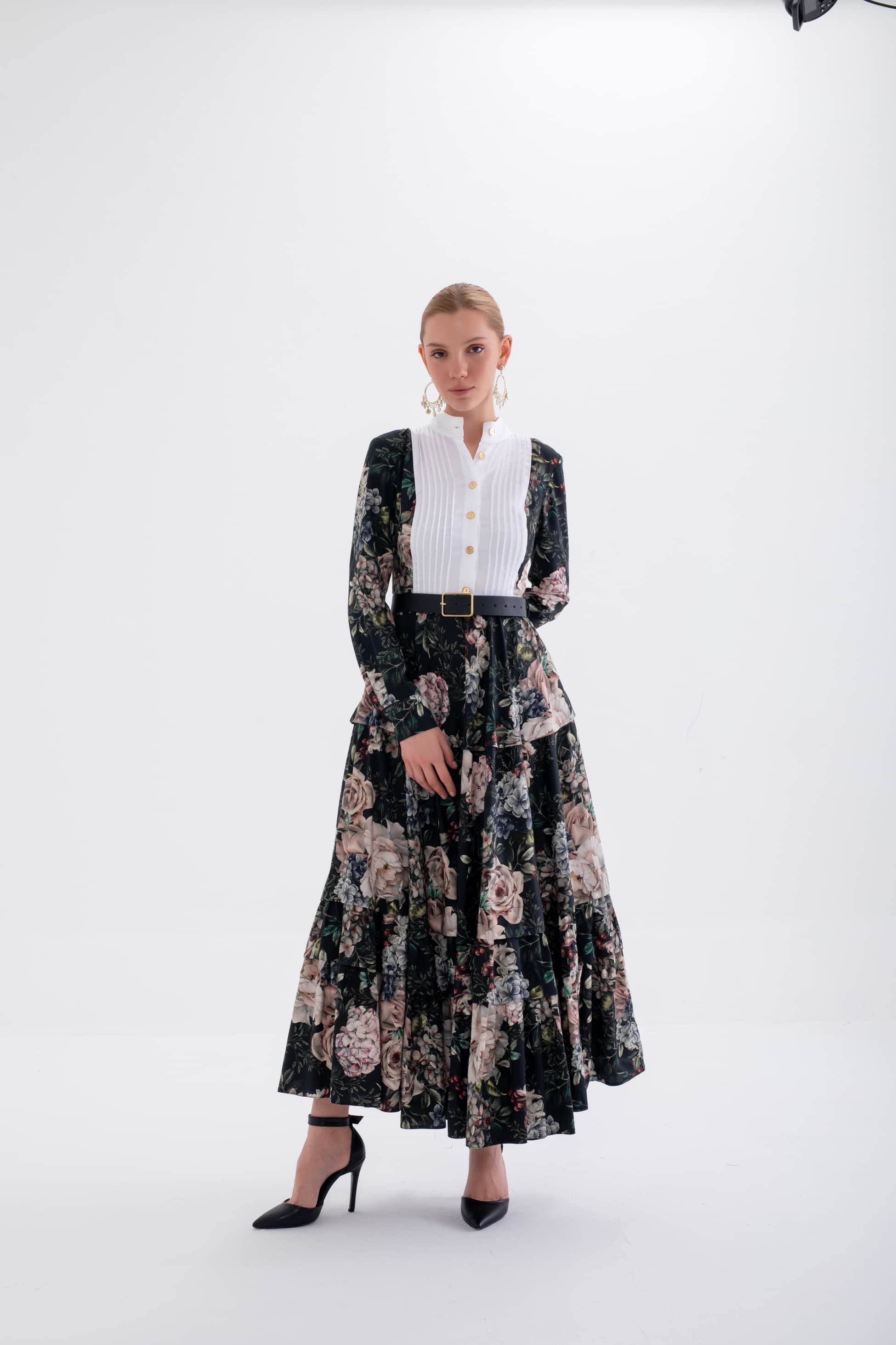 BERRENstudio’nun 2025 İlkbahar/Yaz koleksiyonunun çarpıcı parçalarından biri olan Nehâl, zarafetin cesur ve şiirsel bir yorumudur.Siyah zemin üzerine yerleştirilen şakayık ve yıldız çiçeği desenleri, doğanın etkileyici renklerini yansıtırken; elbisenin ön kısmında yer alan beyaz nervür paneli, tasarıma aydınlık bir vurgu kazandırır.