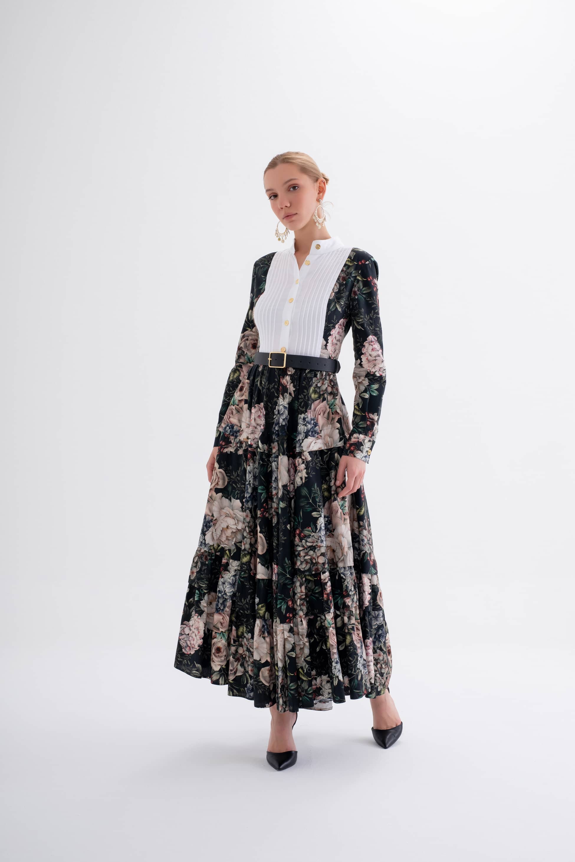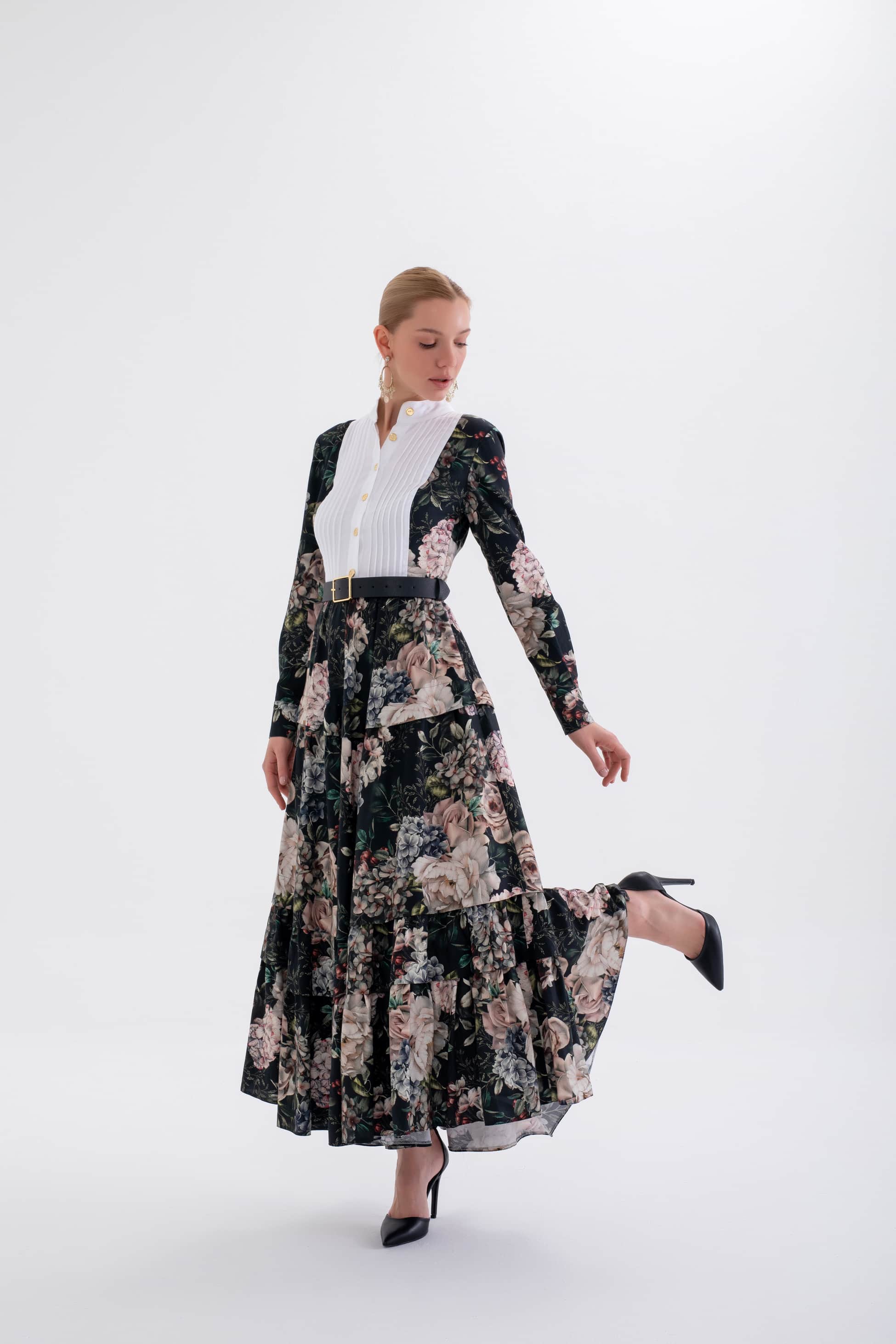 Nehâl Elbise Kat Kat Volanlı Nervür Detaylı Siyah Çiçekli Elbise – %100 Pamuk, Astarlı, Dik Yaka, Uzun Kollu Yazlık Elbise