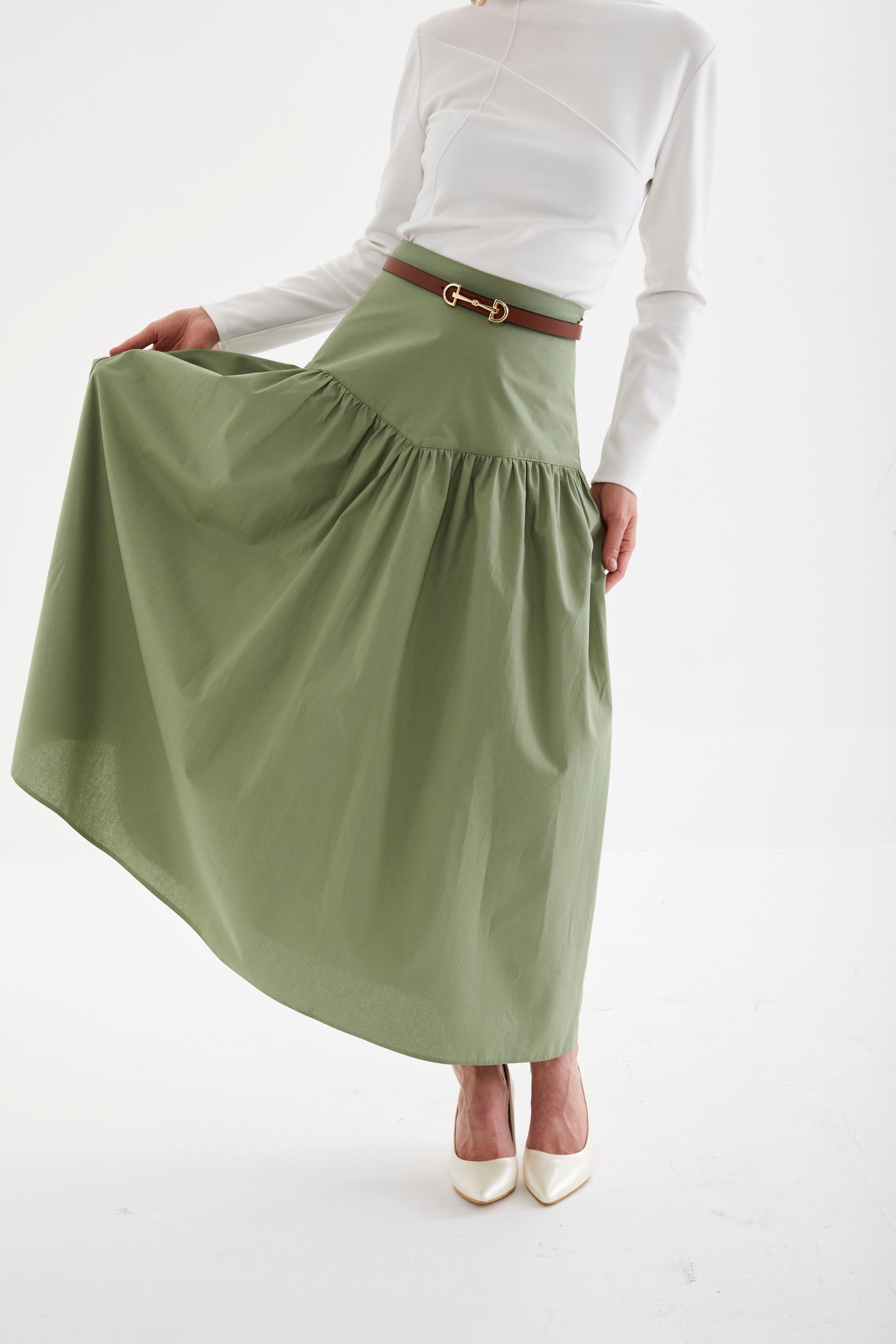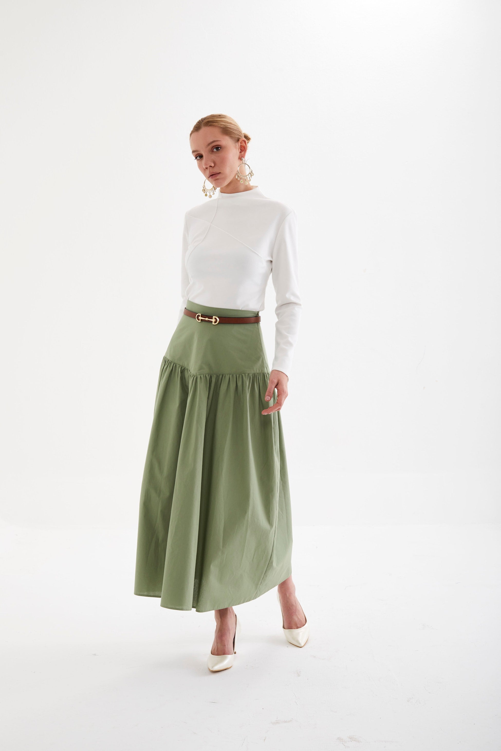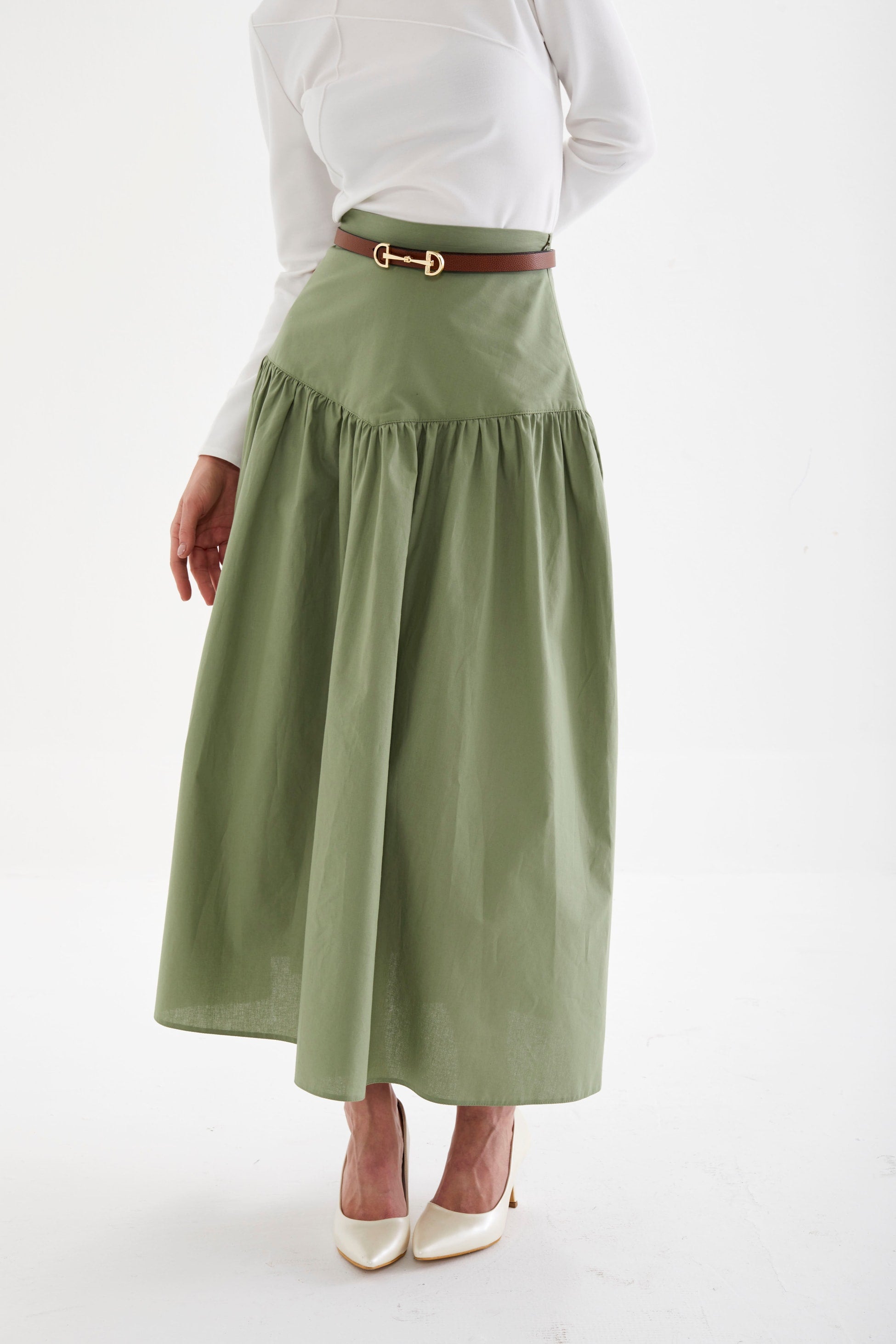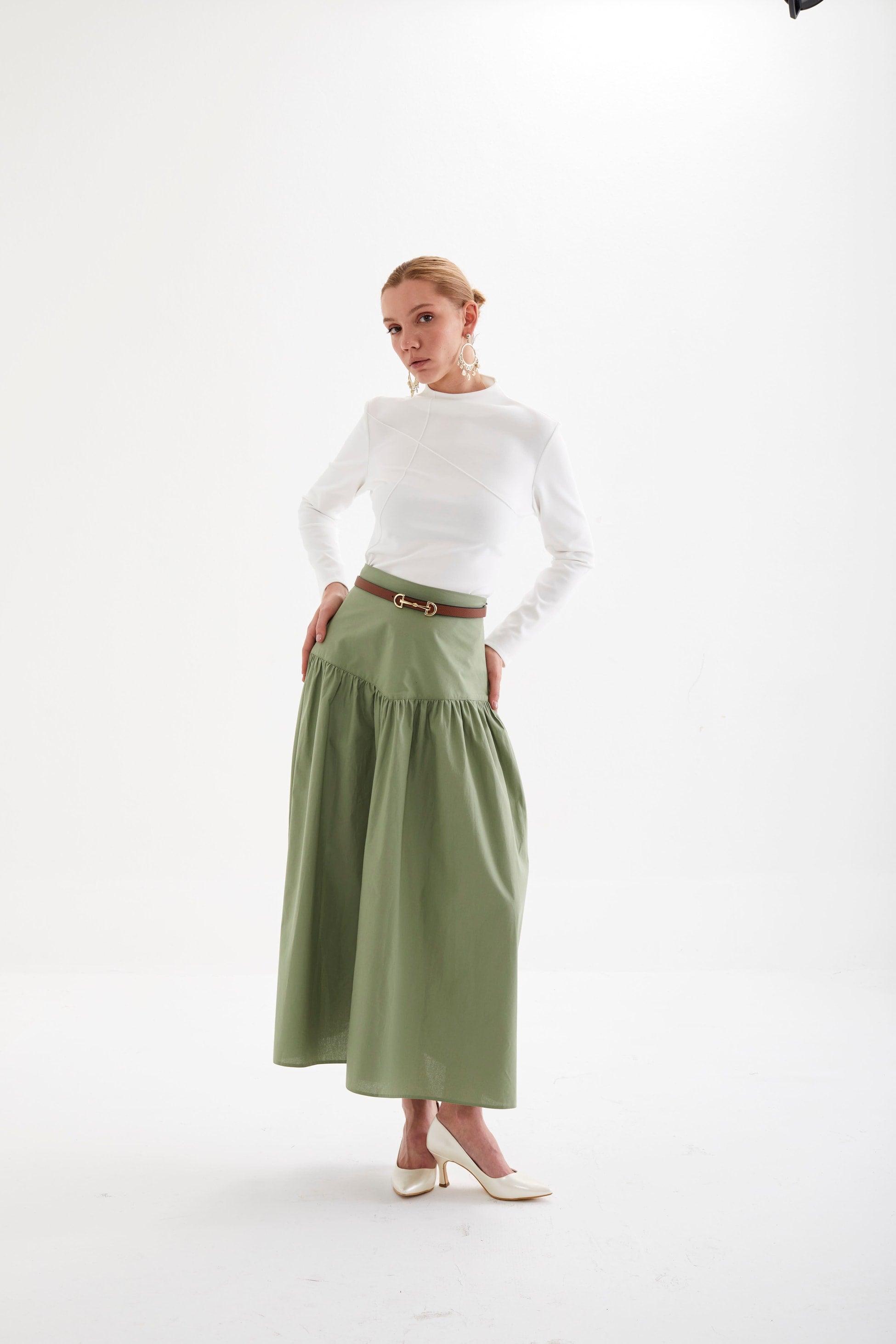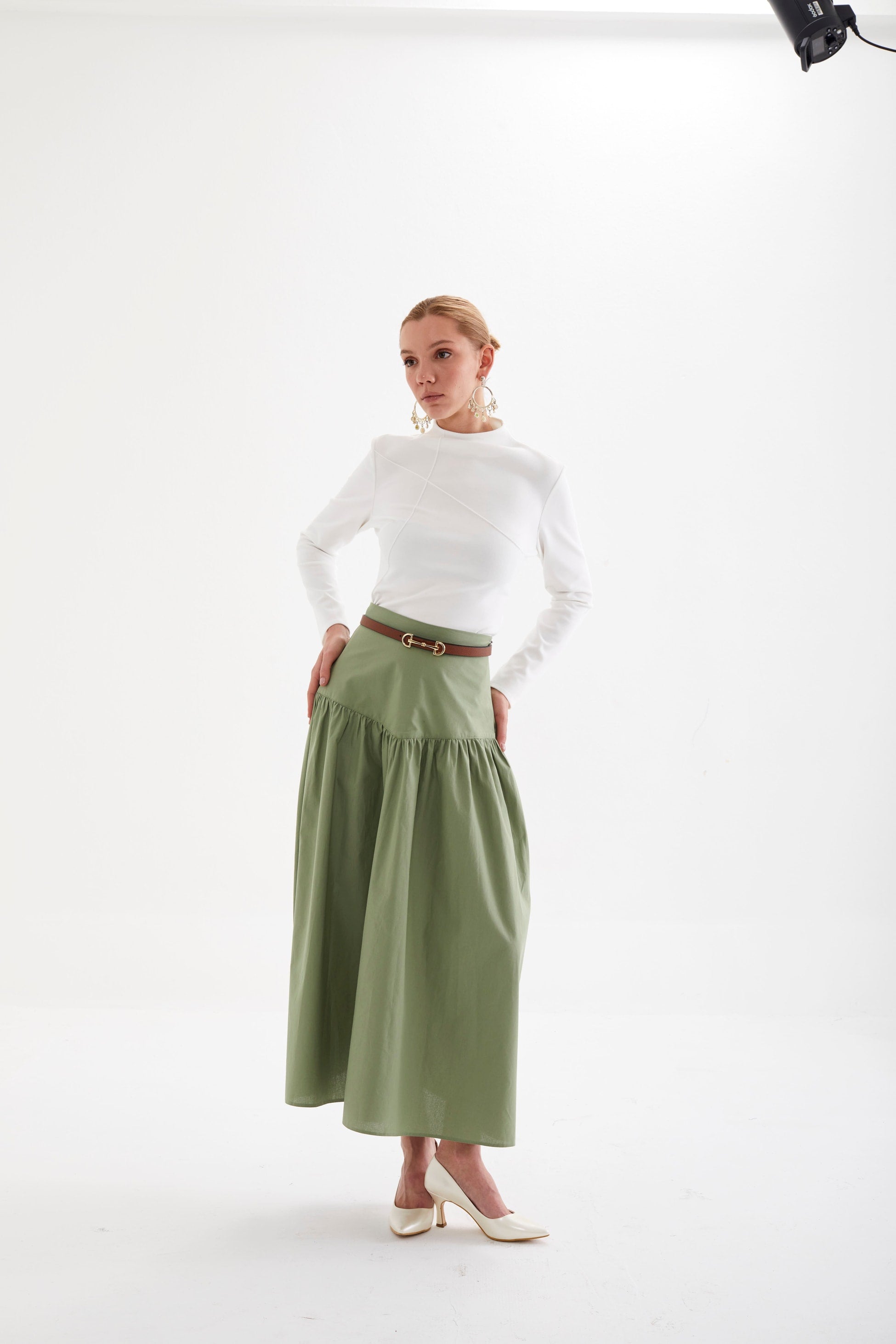 Meriva, çizgilerin dinginliğini ve doğallığını stilinize taşıyor.BERRENstudio 2025 İlkbahar/Yaz koleksiyonunun zarif parçalarından biri olan bu yeşil etek, büzgülü formdaki tasarımıyla feminen silueti zarif bir şekilde vurgular.