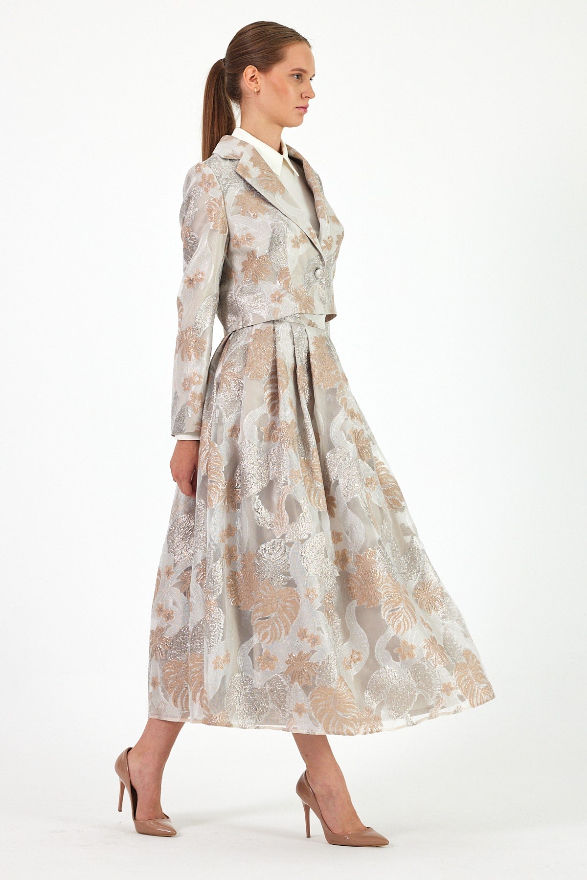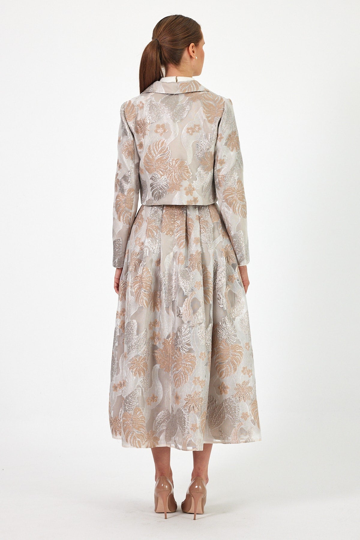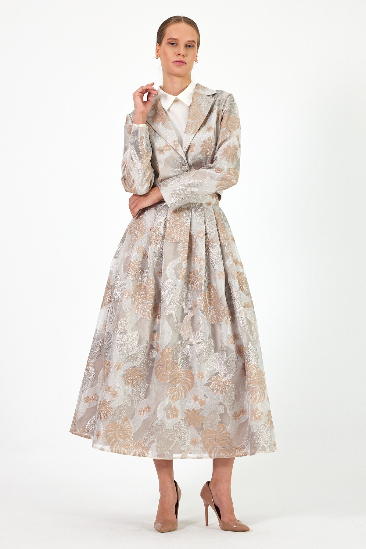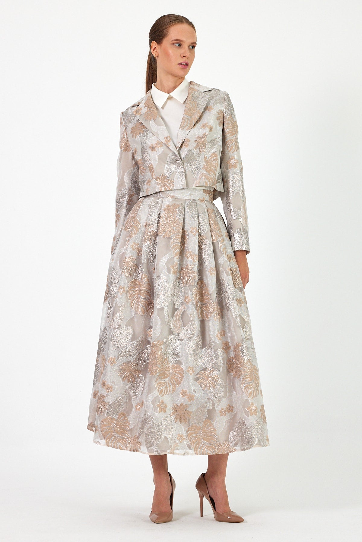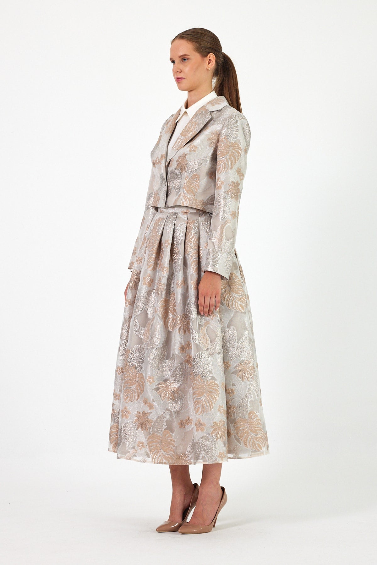 Takımın eteği, diz hizasında biten şık ve zarif bir kesime sahiptir. Brokar kumaşın dokusuyla hareket kazanan etek, klasik tasarımına rağmen dinamik bir görünüme sahip. Vücuda oturan yapısı, hem zarif hem de güçlü bir duruş sağlar. Takım olarak kullanıldığında, Lorenza Etek-Ceket Takımı, her ortama uyum sağlayacak zamansız bir şıklık sunar.