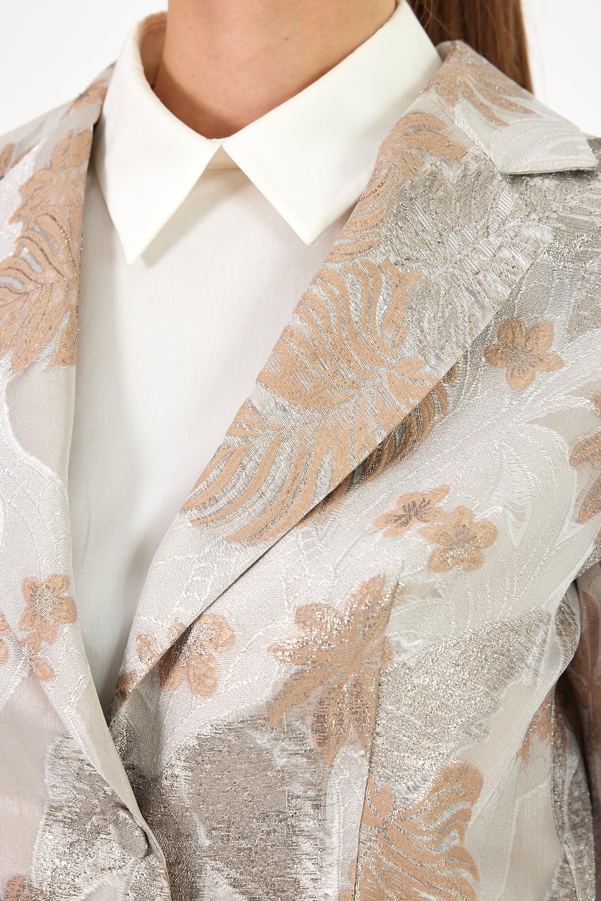 Ceketin zarif kesimi, vücut hatlarınızı nazikçe sararak güçlü bir siluet oluşturur. Ceket, klasik çizgileri modern dokunuşlarla buluşturan bir tasarıma sahip olup, yüksek kaliteli düğme detaylarıyla ön plana çıkar. Yüksek yakası ve detaylı işçiliğiyle hem resmi hem de feminen bir hava katan bu ceket, Lorenza Takım'ın ihtişamlı görünümünü tamamlar.