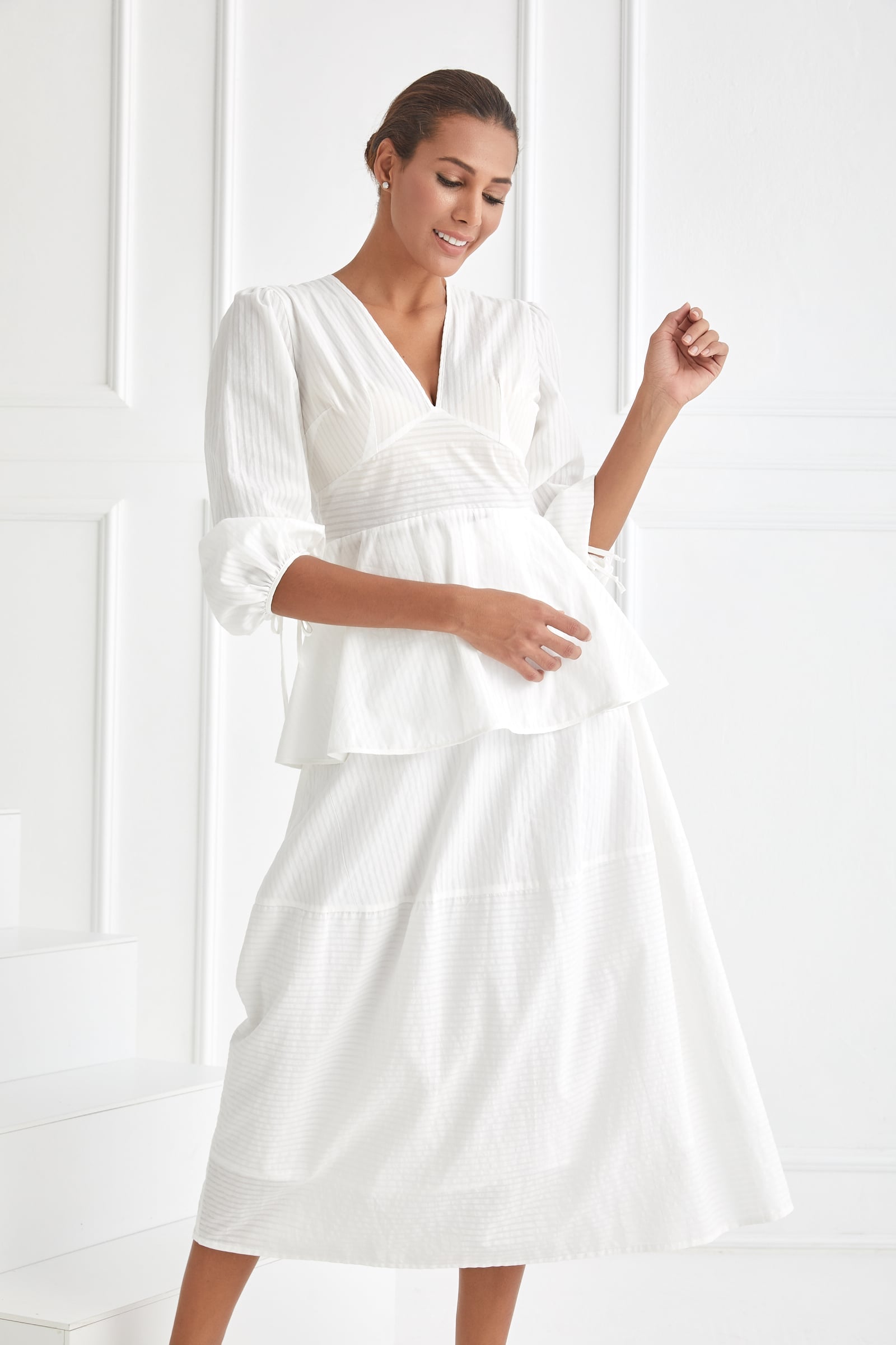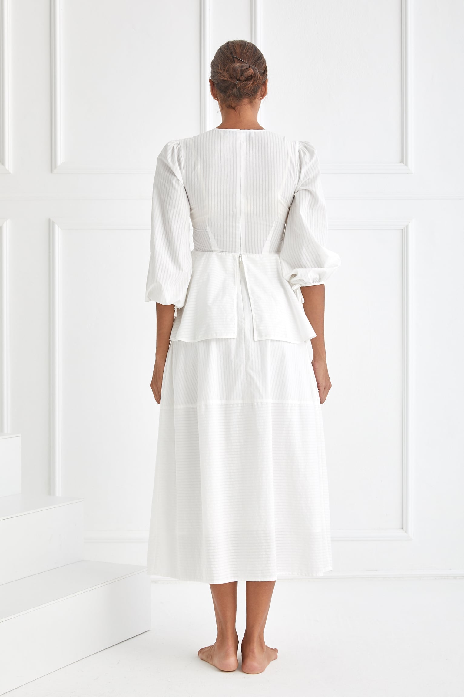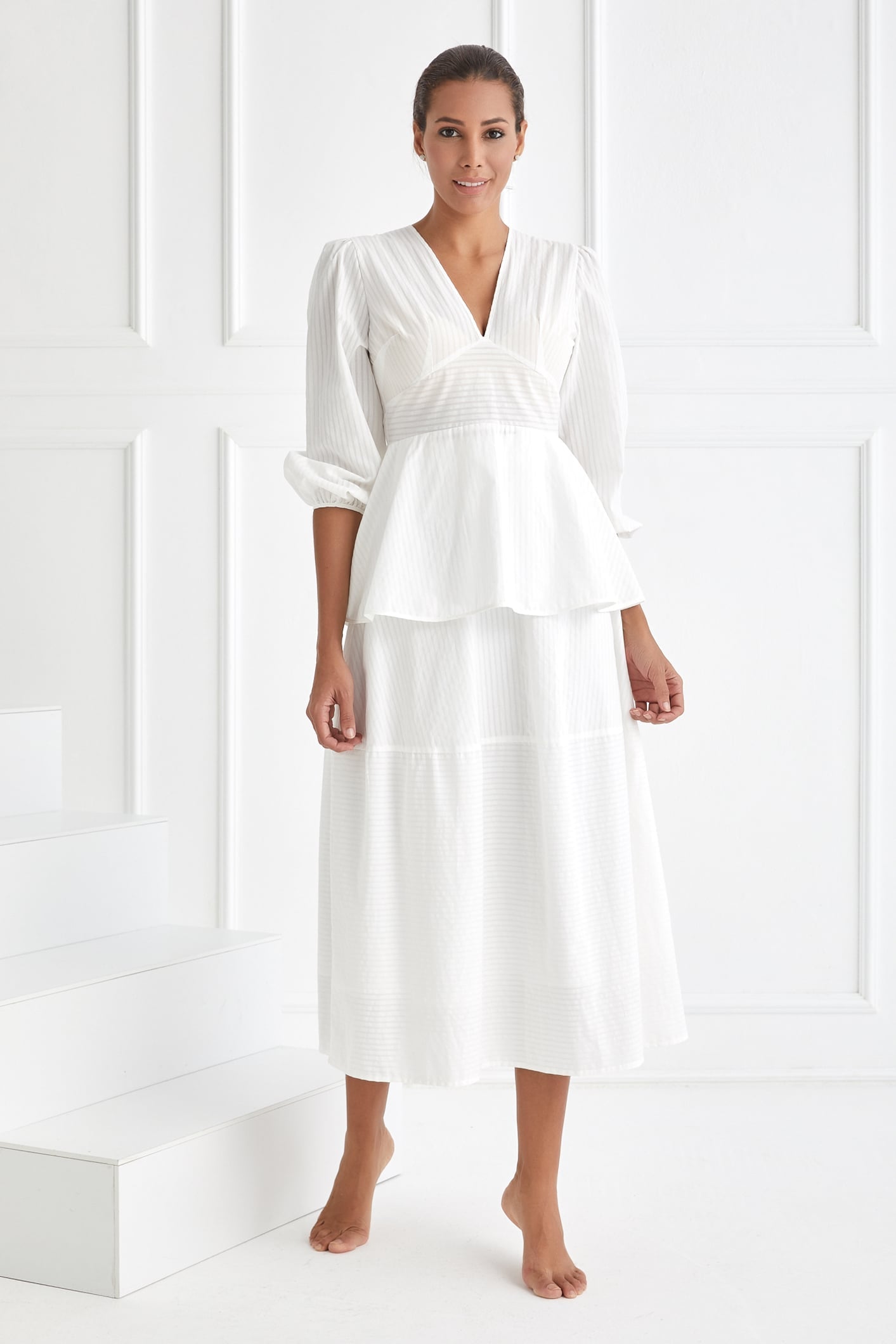 Pure Line İkili Takım, %100 pamuk kumaştan üretilmiş olup, doğal dokusuyla cildinize nefes aldırır. Kumaşın kendisi çizgili olan beyaz etek ve bluz kombinasyonu, modern ve sofistike bir stil sunar. Günlük kullanımda ve özel davetlerde göz alıcı bir görünüm sağlar.