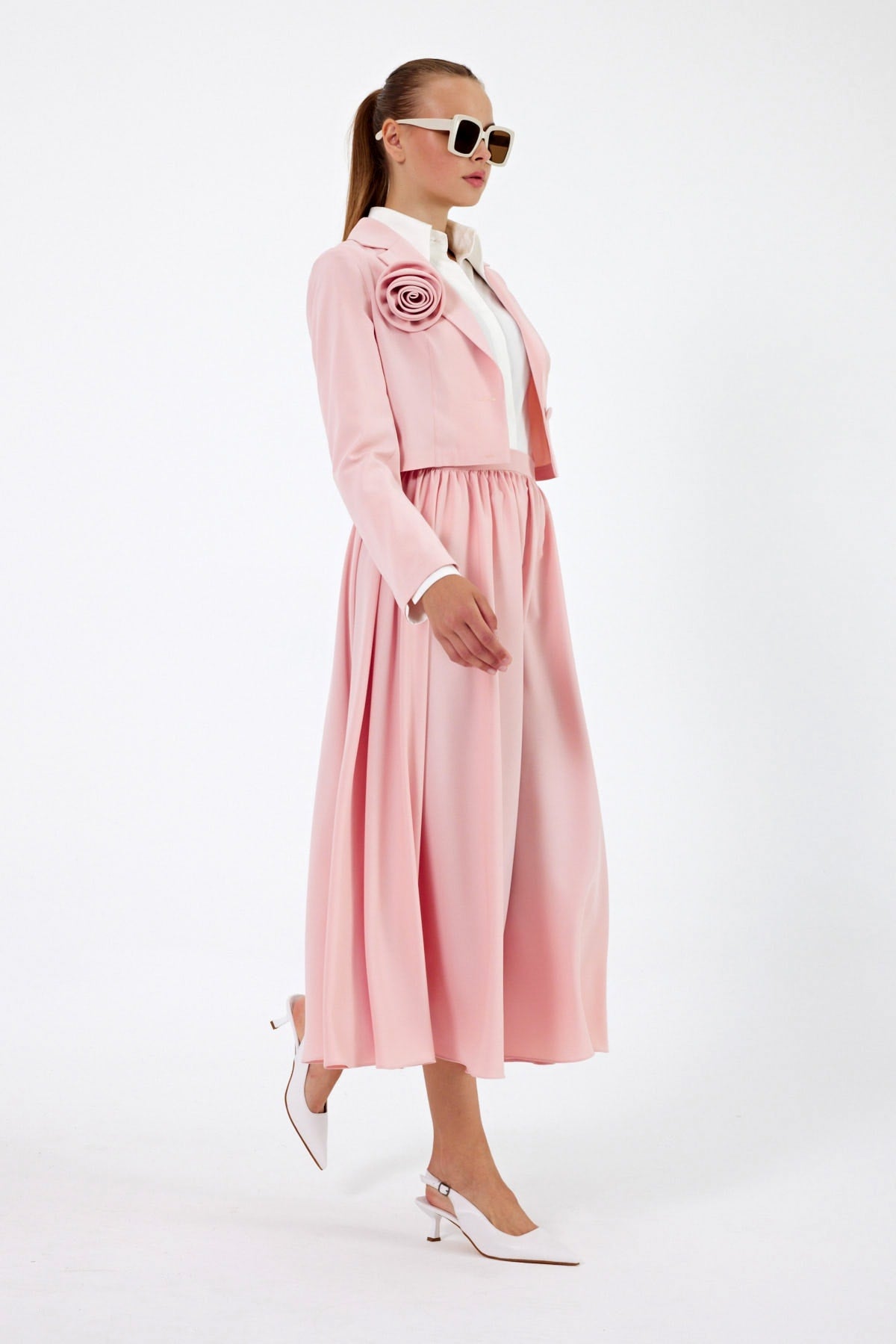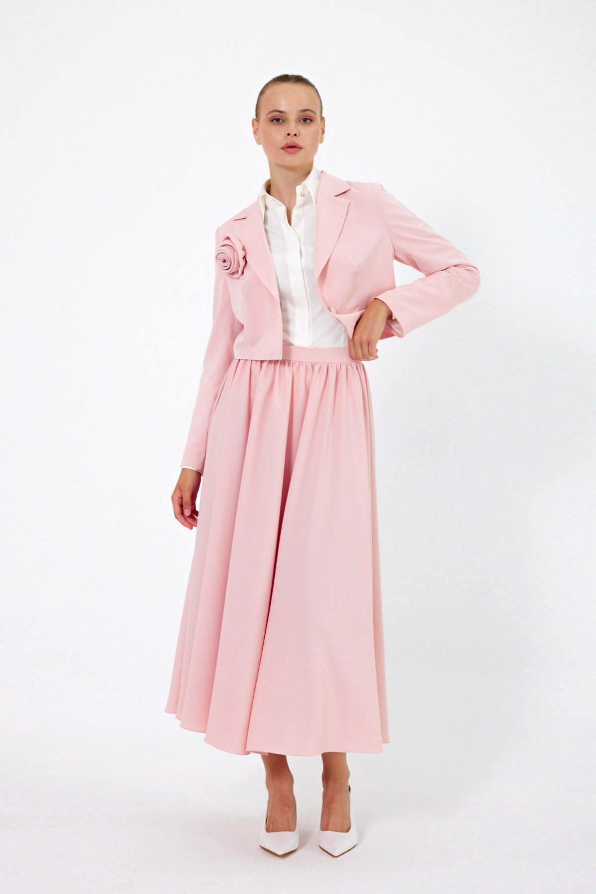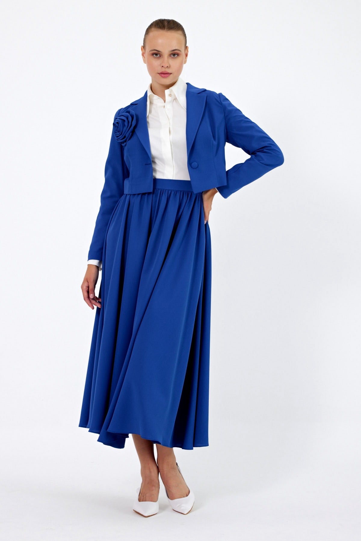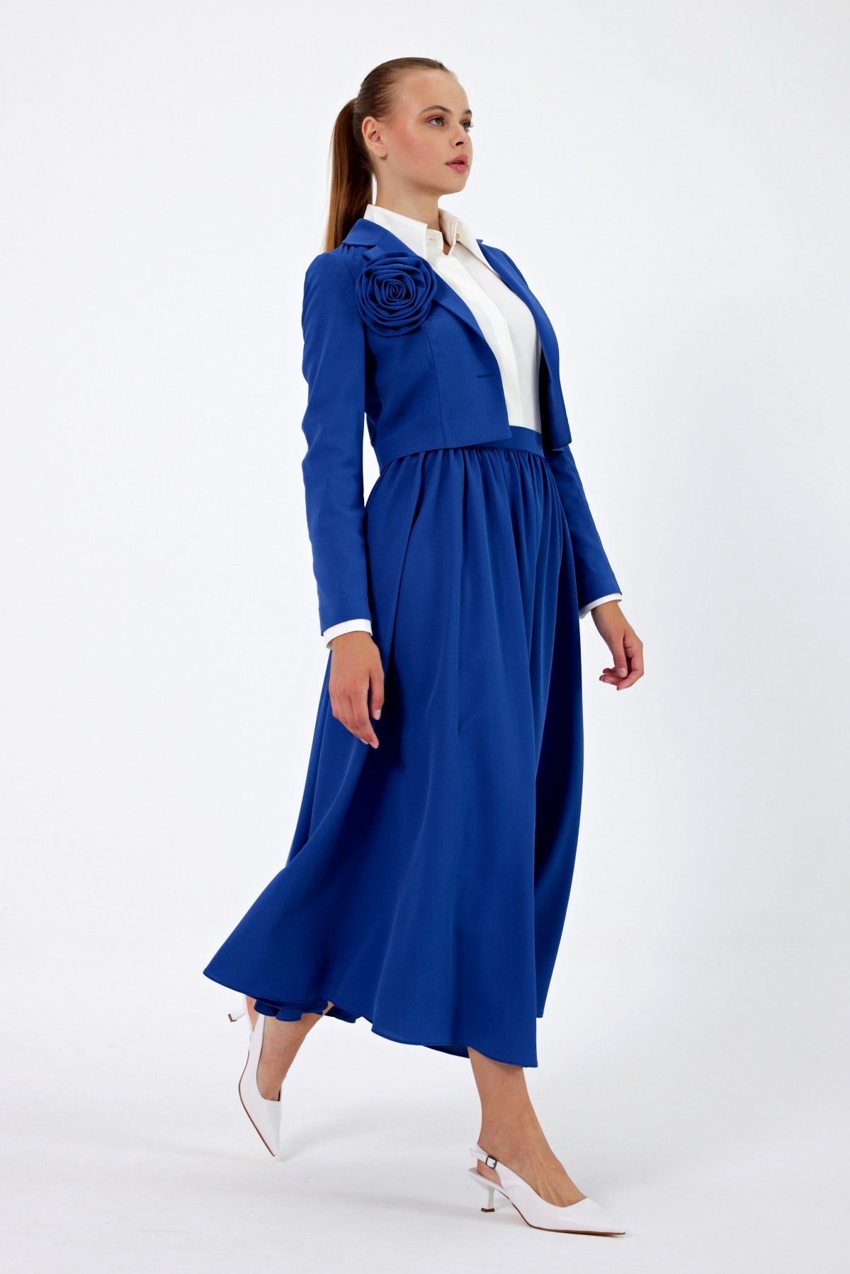 Eteğin bilek boyundaki uzunluğu, modern bir şıklık sunarak takımın zamansız duruşunu tamamlar. Bu uzunluk, hem klasik hem de çağdaş bir görünüm elde etmenize yardımcı olur. Akışkan kumaşıyla vücuda zarif bir şekilde oturan etek, her adımda rahatlık ve şıklık sunar. Etek, beli vurgulayan hafif yüksek kesimiyle vücudu zarifçe sarar ve altın orana uygun bir siluet yaratır. Bilek boyu uzunluğu sayesinde hem gündüz hem gece kombinlerinde mükemmel bir denge yakalayarak şıklığınızdan ödün vermeden rahatça hareket etmenizi sağlar. Etek, ceketle bir araya geldiğinde ise dengeli ve sofistike bir bütünlük oluşturur.