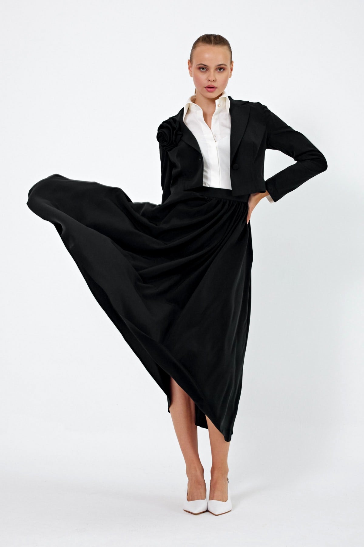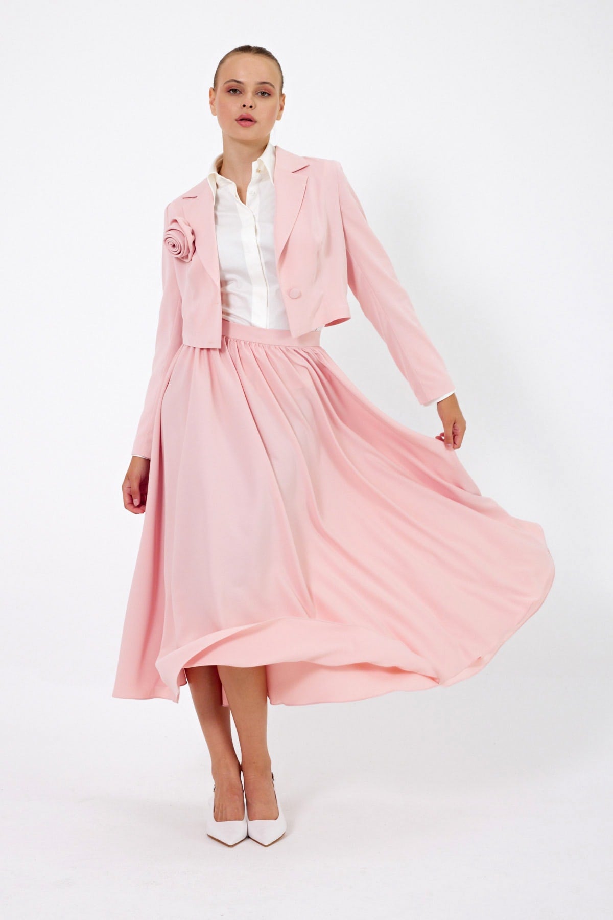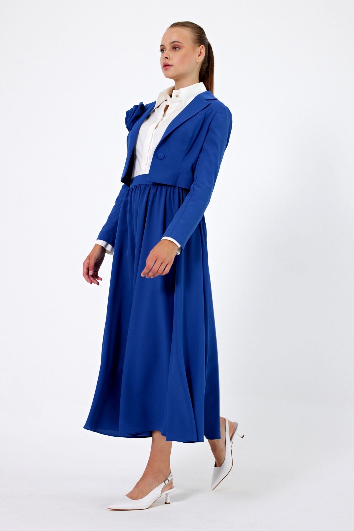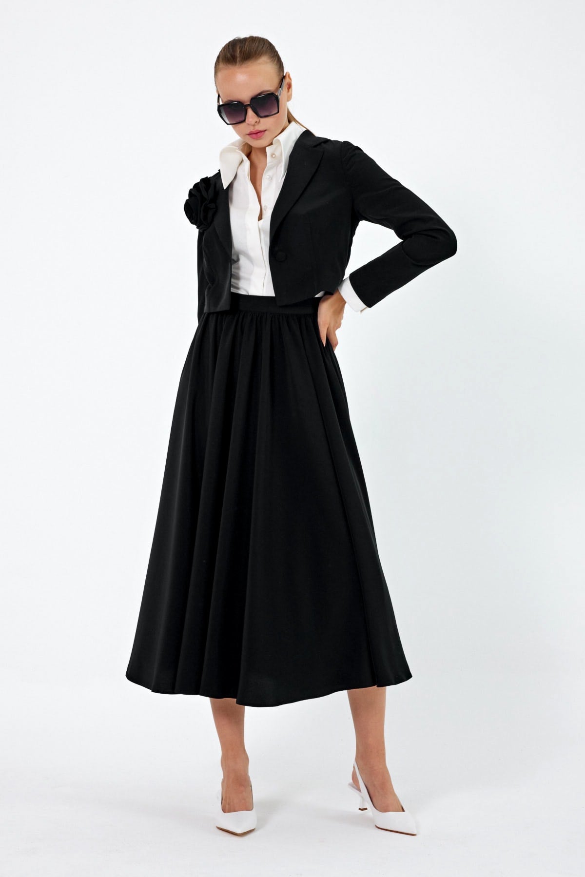 Eteğin bilek boyundaki uzunluğu, modern bir şıklık sunarak takımın zamansız duruşunu tamamlar. Bu uzunluk, hem klasik hem de çağdaş bir görünüm elde etmenize yardımcı olur. Akışkan kumaşıyla vücuda zarif bir şekilde oturan etek, her adımda rahatlık ve şıklık sunar. Etek, beli vurgulayan hafif yüksek kesimiyle vücudu zarifçe sarar ve altın orana uygun bir siluet yaratır. Bilek boyu uzunluğu sayesinde hem gündüz hem gece kombinlerinde mükemmel bir denge yakalayarak şıklığınızdan ödün vermeden rahatça hareket etmenizi sağlar. Etek, ceketle bir araya geldiğinde ise dengeli ve sofistike bir bütünlük oluşturur.