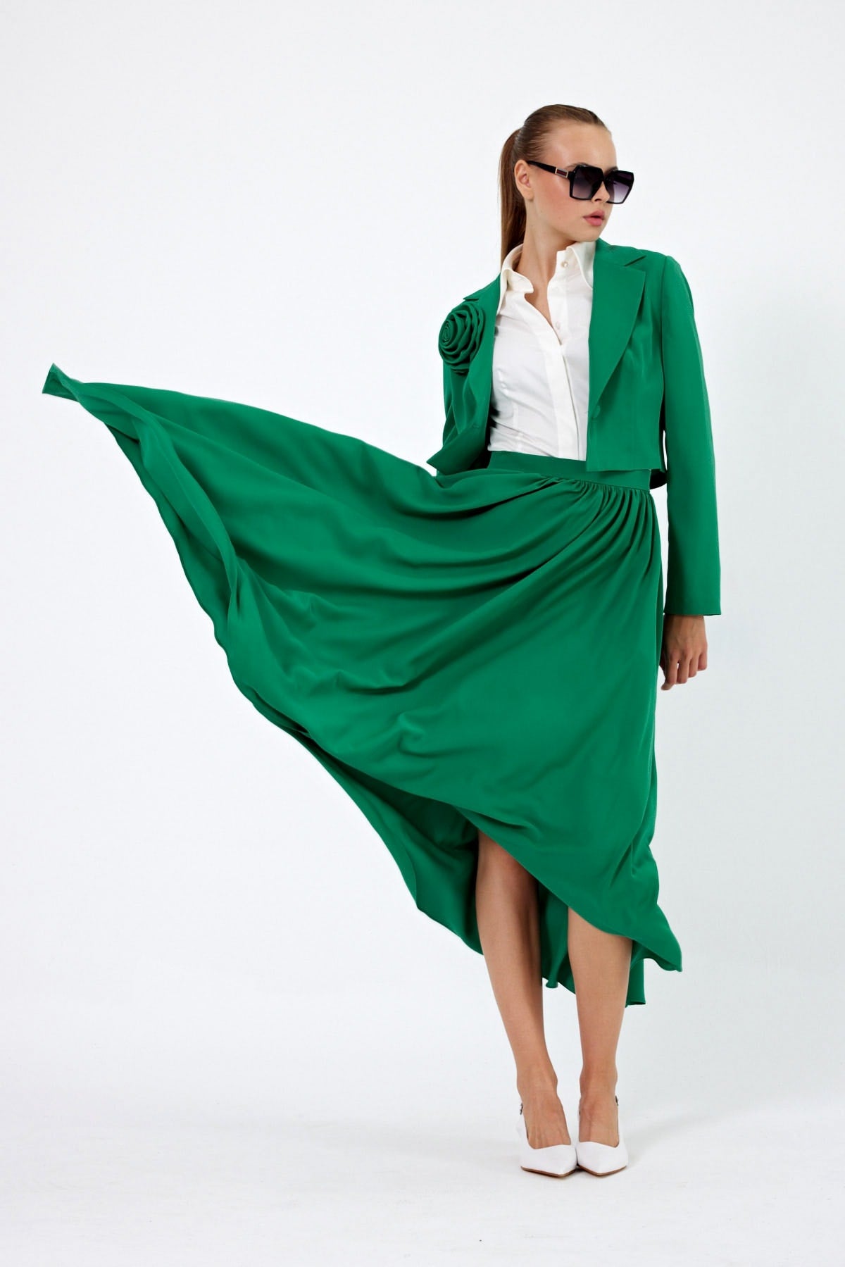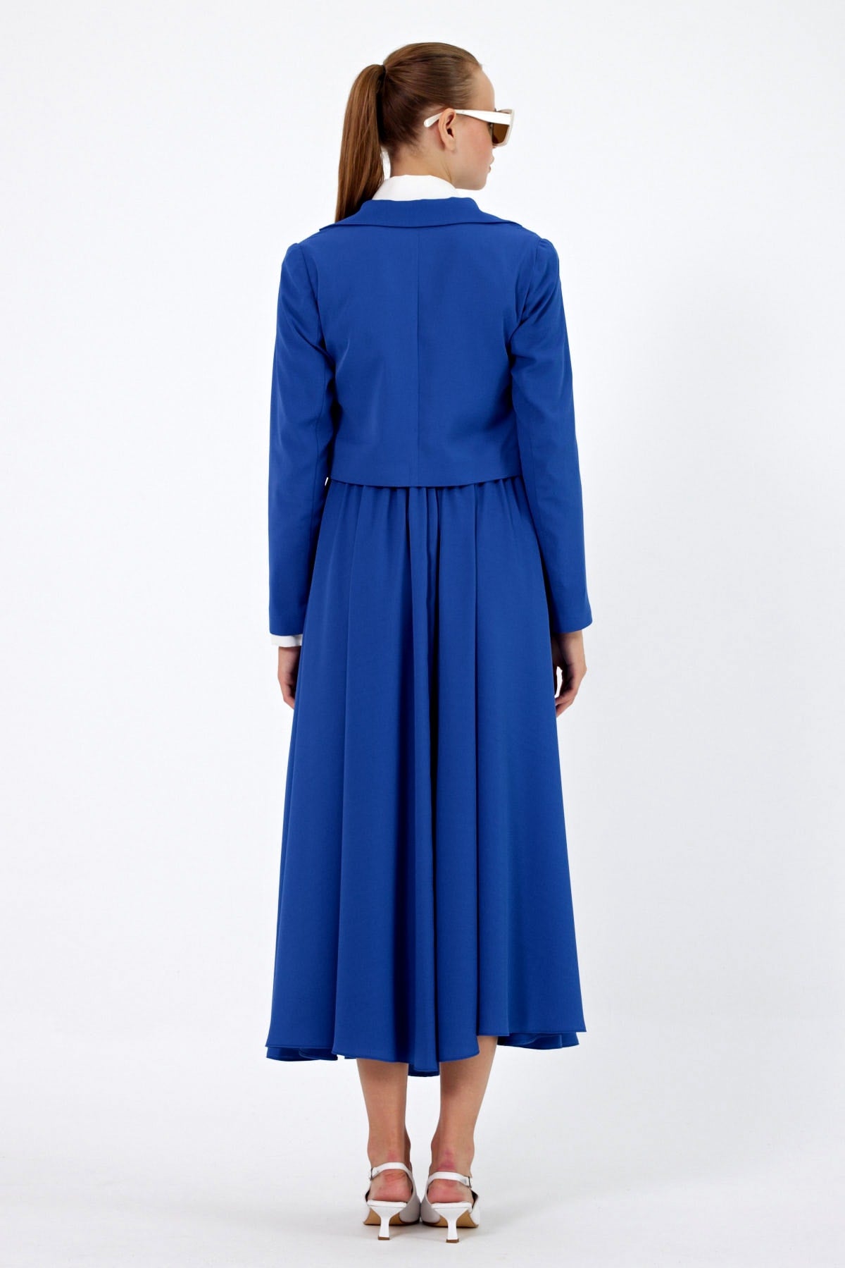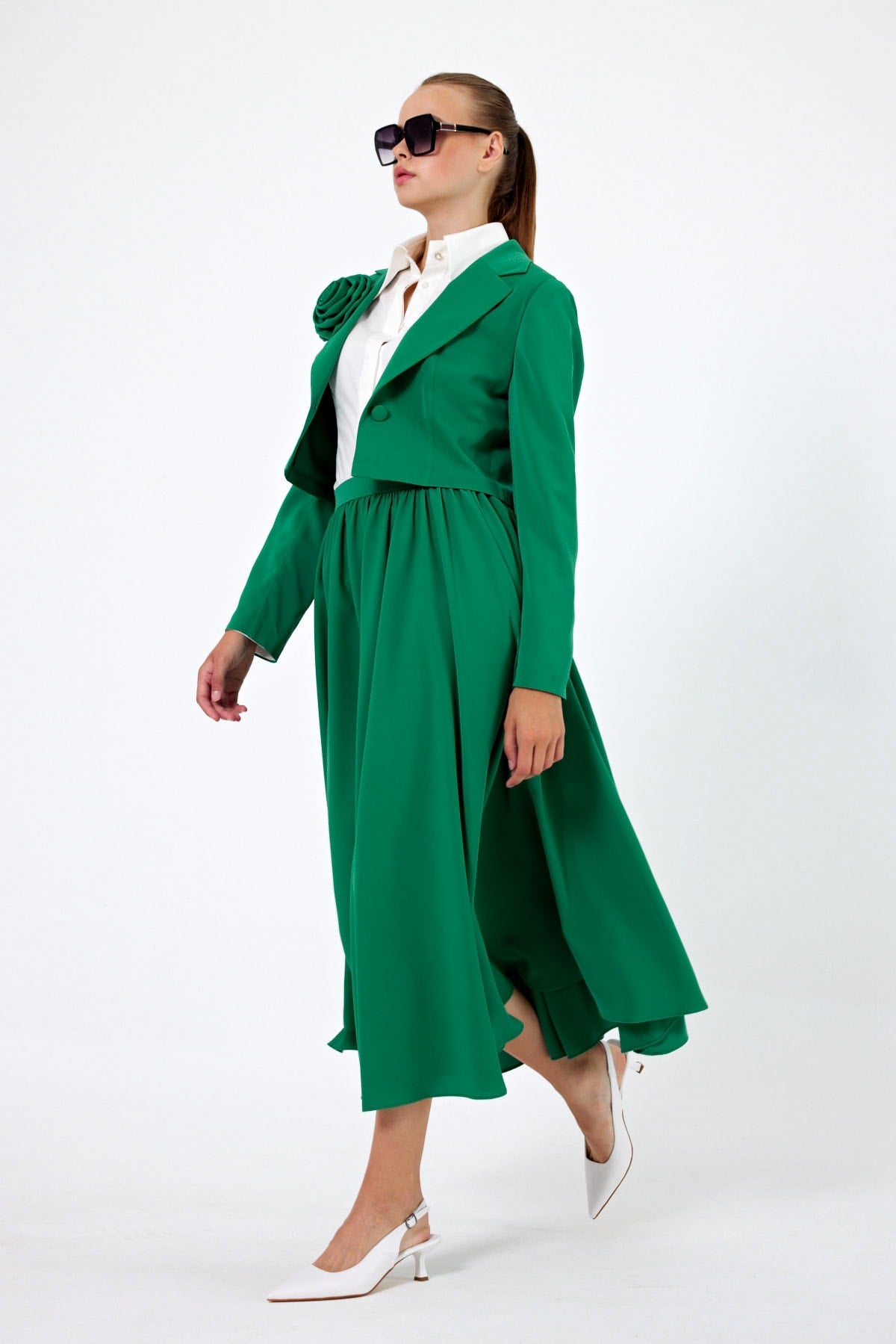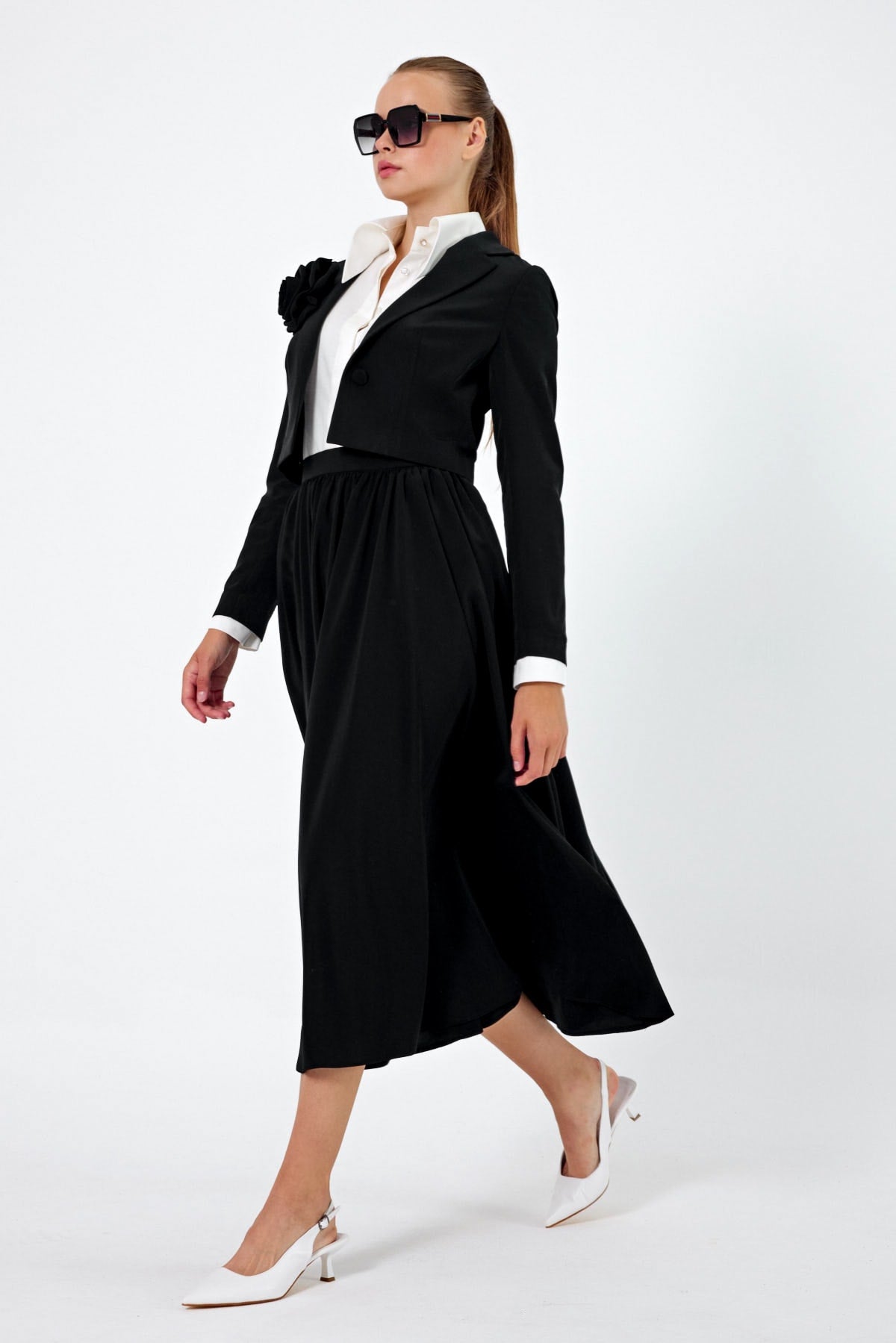 Eteğin bilek boyundaki uzunluğu, modern bir şıklık sunarak takımın zamansız duruşunu tamamlar. Bu uzunluk, hem klasik hem de çağdaş bir görünüm elde etmenize yardımcı olur. Akışkan kumaşıyla vücuda zarif bir şekilde oturan etek, her adımda rahatlık ve şıklık sunar. Etek, beli vurgulayan hafif yüksek kesimiyle vücudu zarifçe sarar ve altın orana uygun bir siluet yaratır. Bilek boyu uzunluğu sayesinde hem gündüz hem gece kombinlerinde mükemmel bir denge yakalayarak şıklığınızdan ödün vermeden rahatça hareket etmenizi sağlar. Etek, ceketle bir araya geldiğinde ise dengeli ve sofistike bir bütünlük oluşturur.