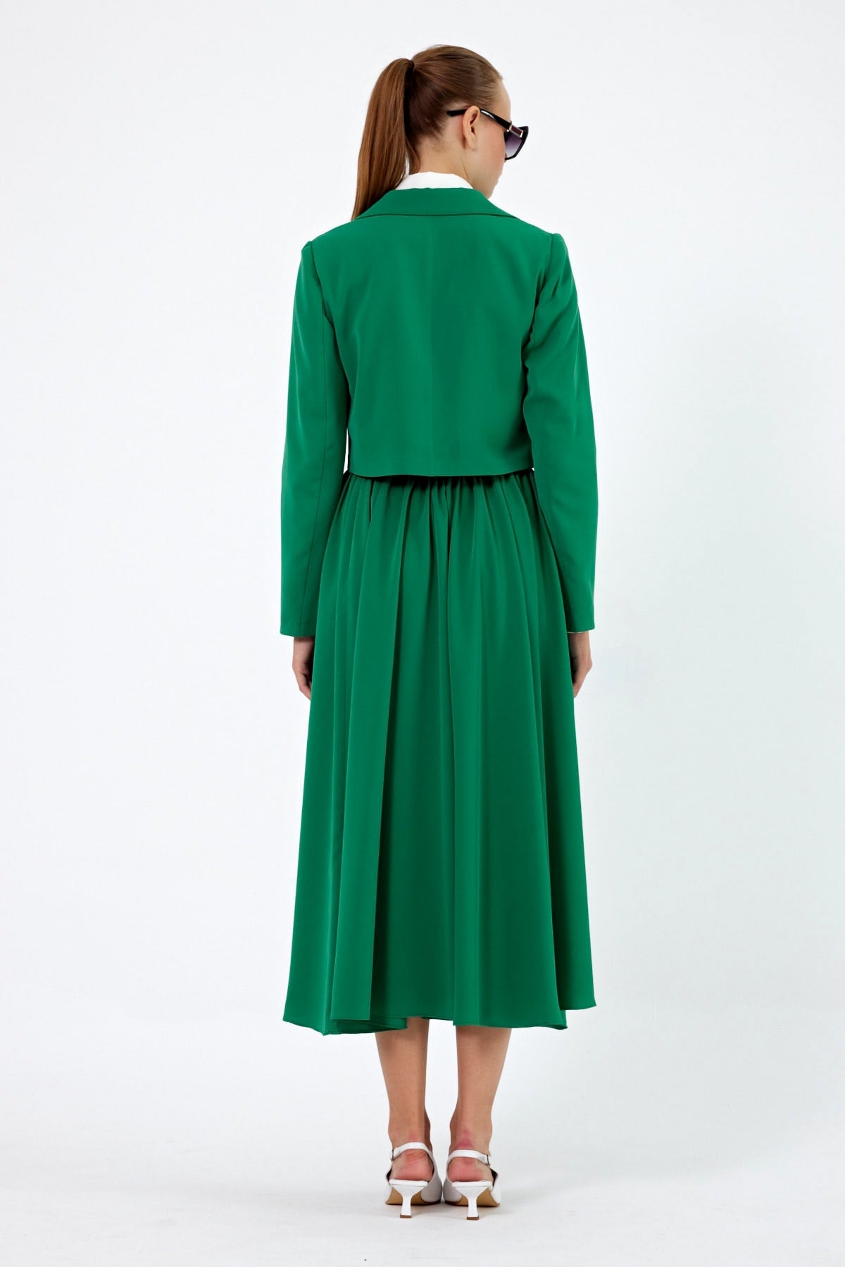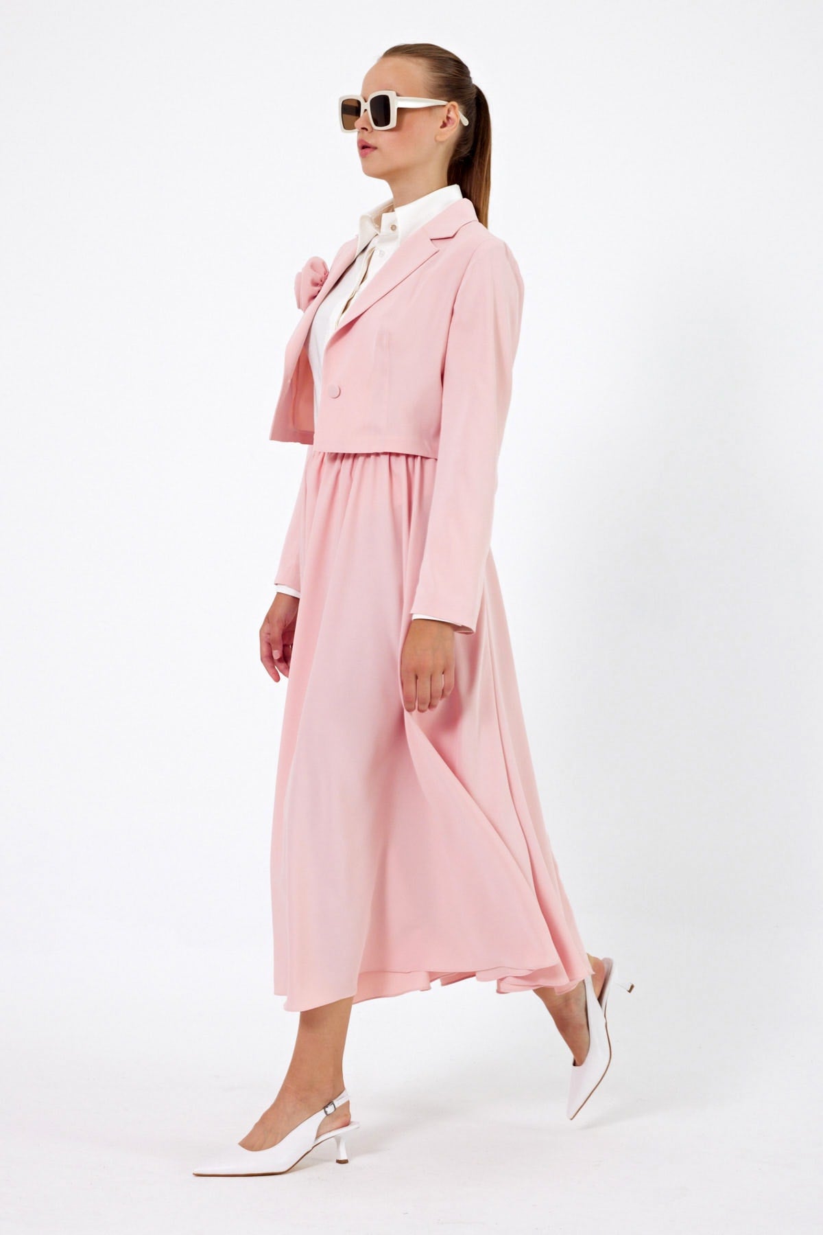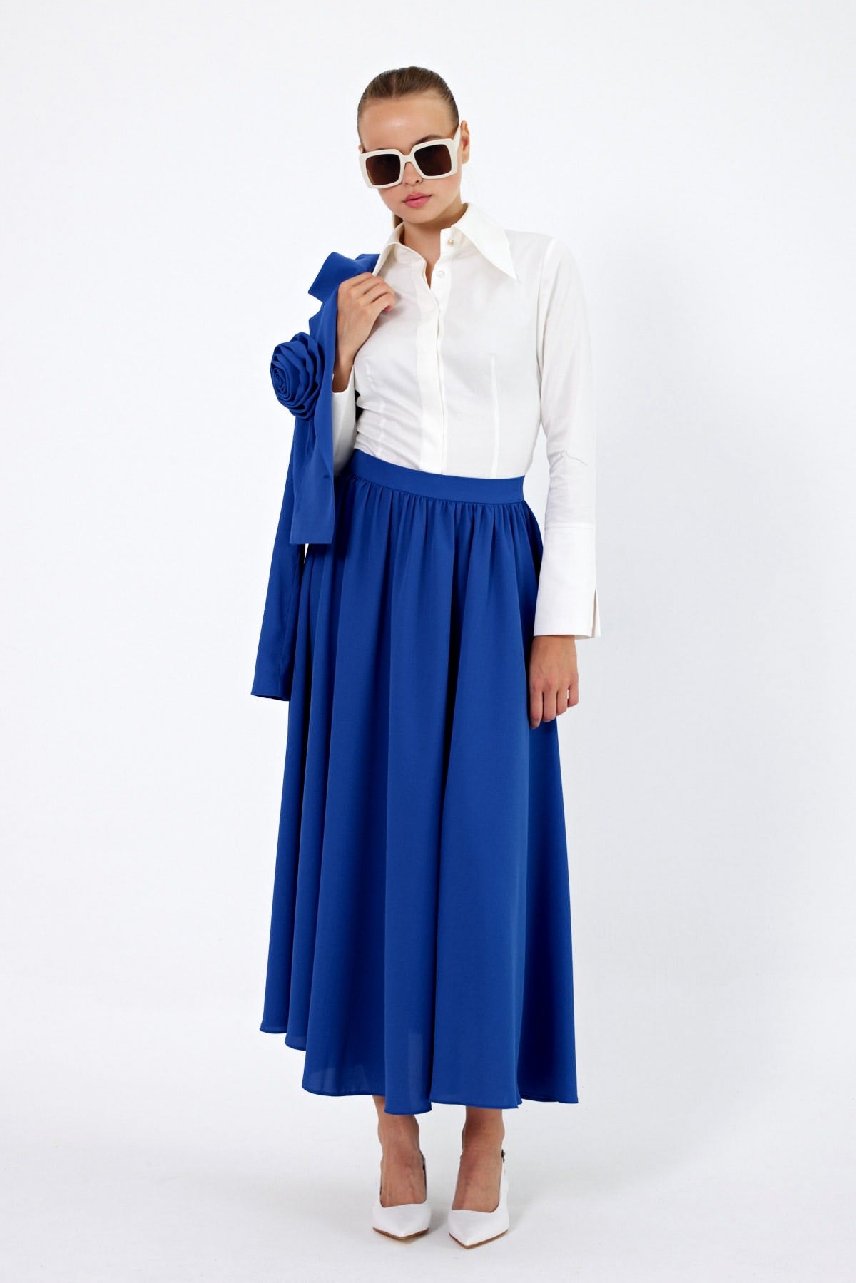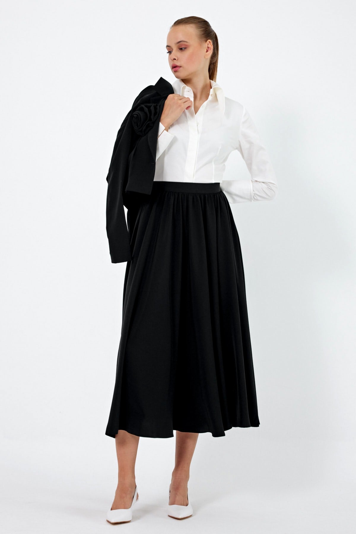 Eteğin bilek boyundaki uzunluğu, modern bir şıklık sunarak takımın zamansız duruşunu tamamlar. Bu uzunluk, hem klasik hem de çağdaş bir görünüm elde etmenize yardımcı olur. Akışkan kumaşıyla vücuda zarif bir şekilde oturan etek, her adımda rahatlık ve şıklık sunar. Etek, beli vurgulayan hafif yüksek kesimiyle vücudu zarifçe sarar ve altın orana uygun bir siluet yaratır. Bilek boyu uzunluğu sayesinde hem gündüz hem gece kombinlerinde mükemmel bir denge yakalayarak şıklığınızdan ödün vermeden rahatça hareket etmenizi sağlar. Etek, ceketle bir araya geldiğinde ise dengeli ve sofistike bir bütünlük oluşturur.