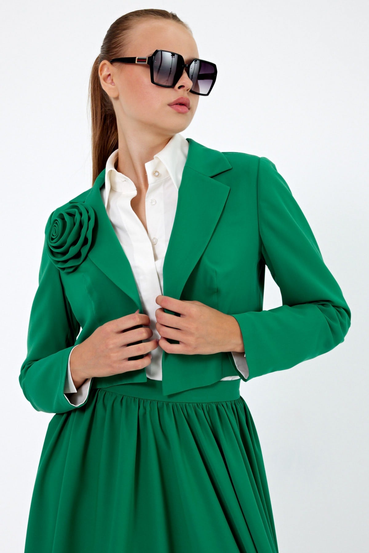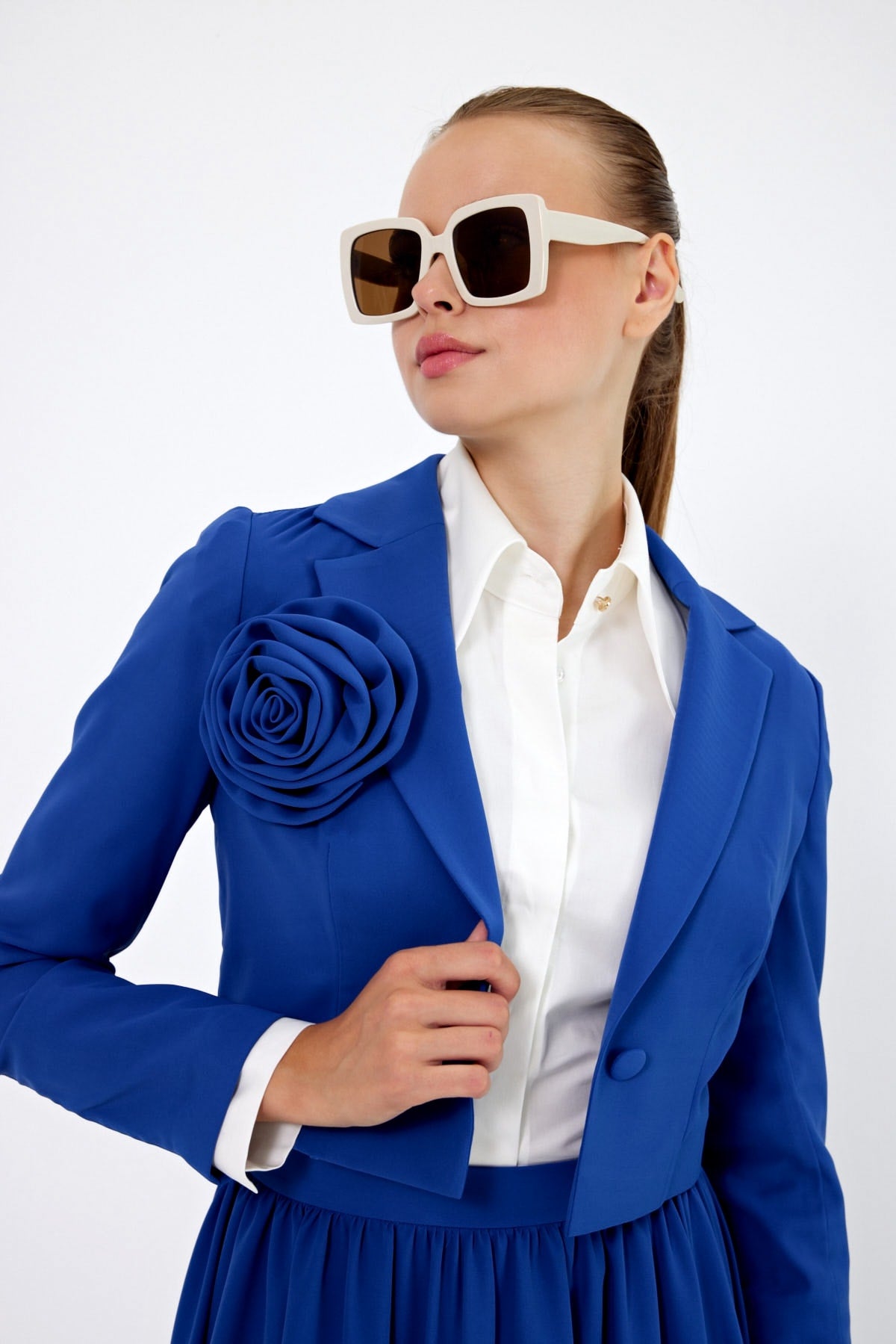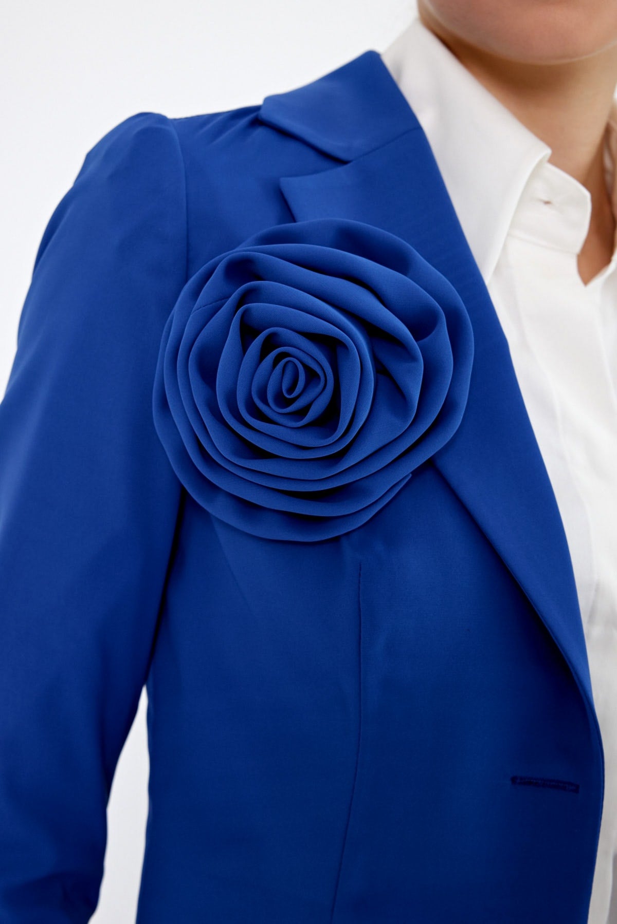 Takımın en dikkat çekici özelliklerinden biri, ceketinin yakasında yer alan zarif gül detayıdır. Bu romantik dokunuş, tasarıma sofistike bir feminen hava katarken, her ortamda şıklığınızla dikkat çekmenizi sağlar. Gül detayı, takımın genelinde yer alan minimal ve ince işçilikle mükemmel bir uyum içinde olup, tasarıma hem sanatsal hem de romantik bir derinlik kazandırır. Bu benzersiz detay, Rosalyn İkili Takım’ı sıradan takımlardan ayıran ve ona özel bir anlam katan unsurlardan biridir. Ceket, zarif dikiş detayları ve kusursuz kesimiyle vücut hatlarınıza uyum sağlar, omuzlardaki yapılandırılmış formu ise güçlü ve kendine güvenen bir siluet sunar.