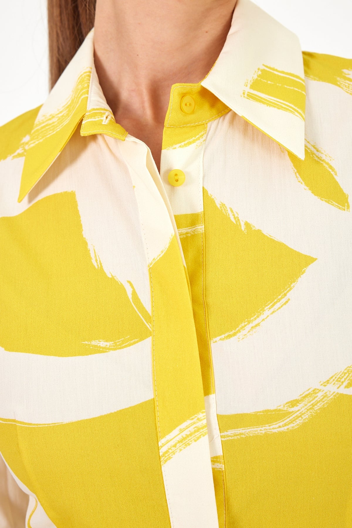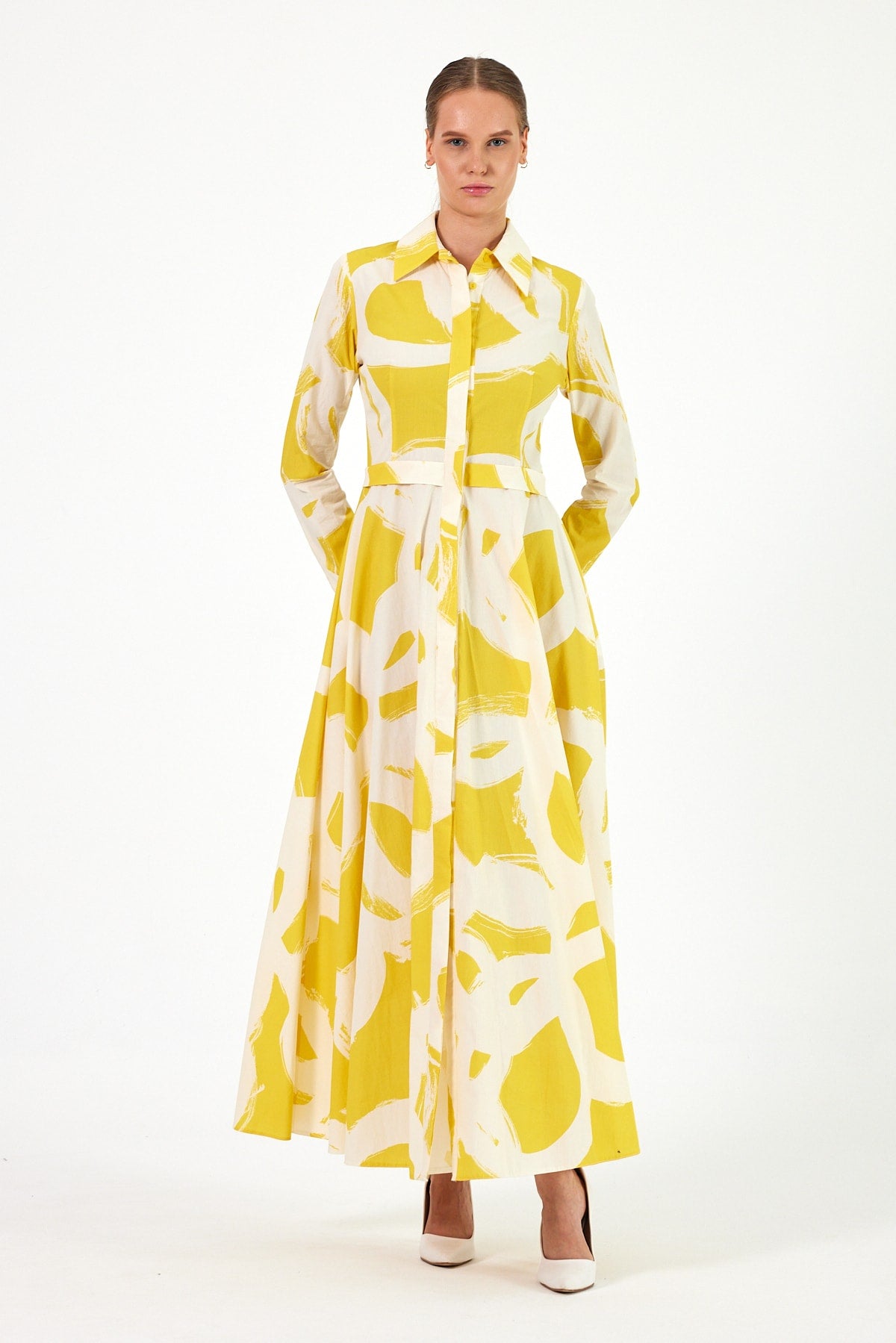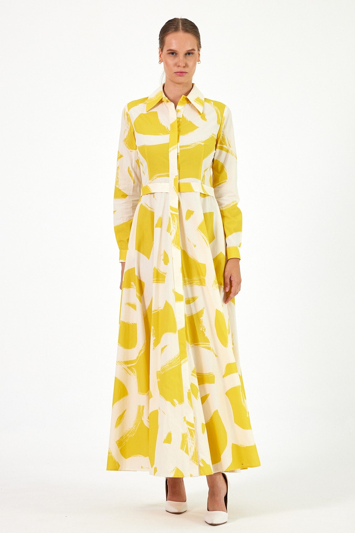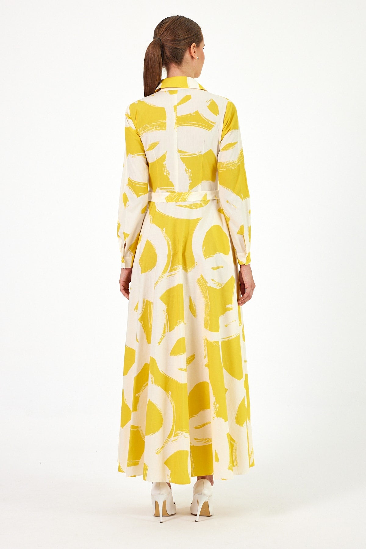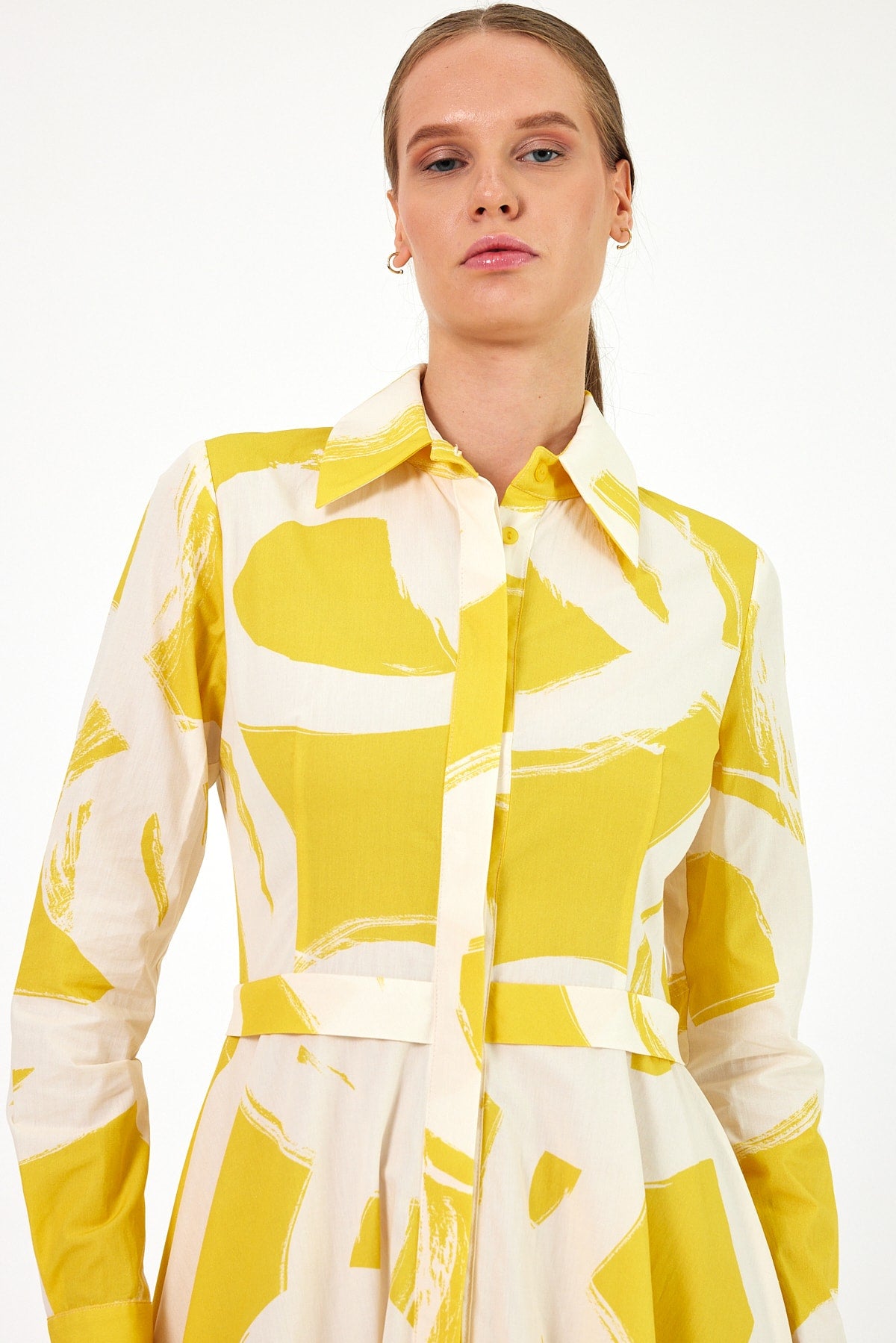 Gömlek elbise formu, hem rahatlık hem de zarafeti bir arada sunar. Düğmeli ön kapama, klasik gömlek detaylarıyla modern bir şıklık sunarken, bel kısmındaki kuşak detayı vücut hatlarınızı zarif bir şekilde ortaya çıkarır. Belden kuşaklı tasarım, istenilen ölçüde ayarlanabilir ve vücudun doğal hatlarını vurgulayan feminen bir siluet oluşturur. Bu sayede elbise, vücuda oturan fakat hareket özgürlüğünü kısıtlamayan bir forma sahiptir. Uzun ve hafif akışkan etek kesimi, adımlarınıza zarif bir hareketlilik katarak sofistike bir hava yaratır.