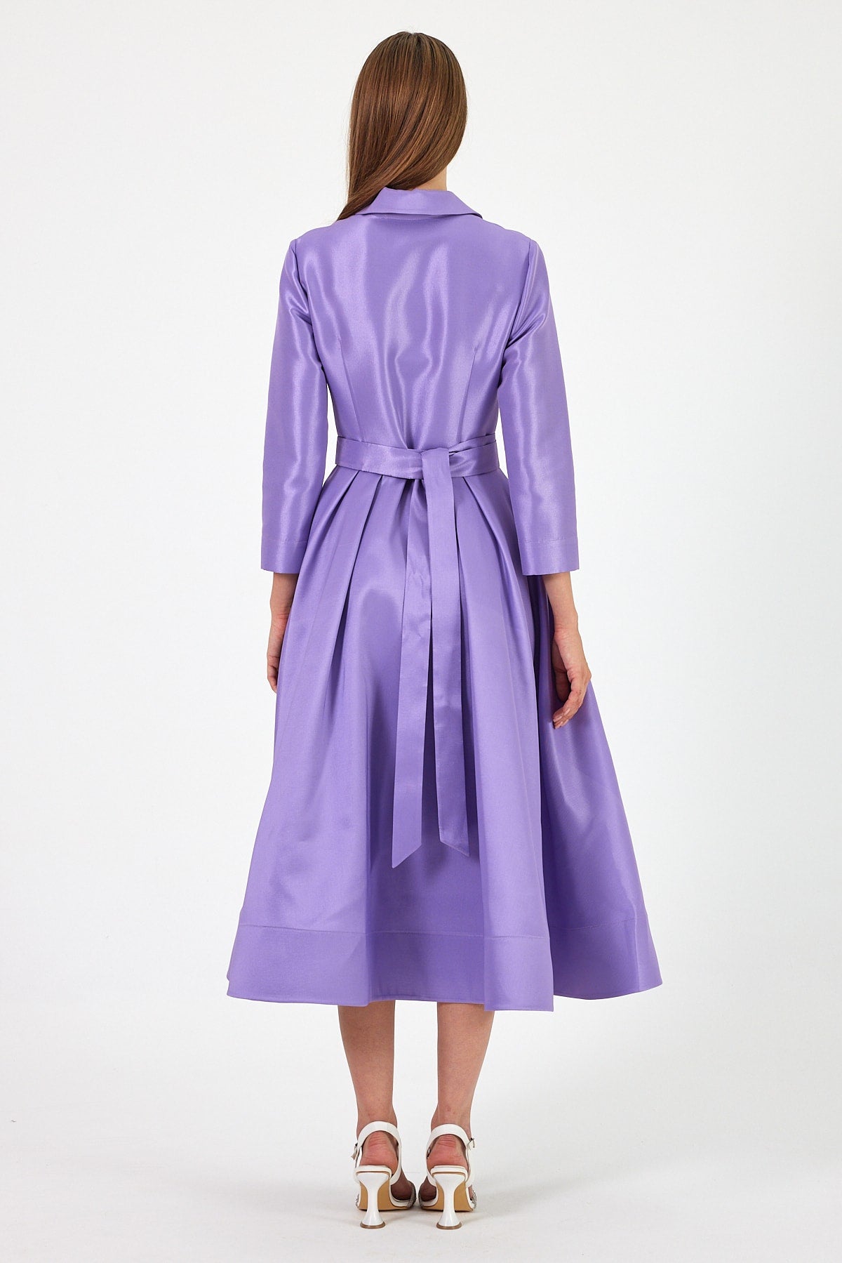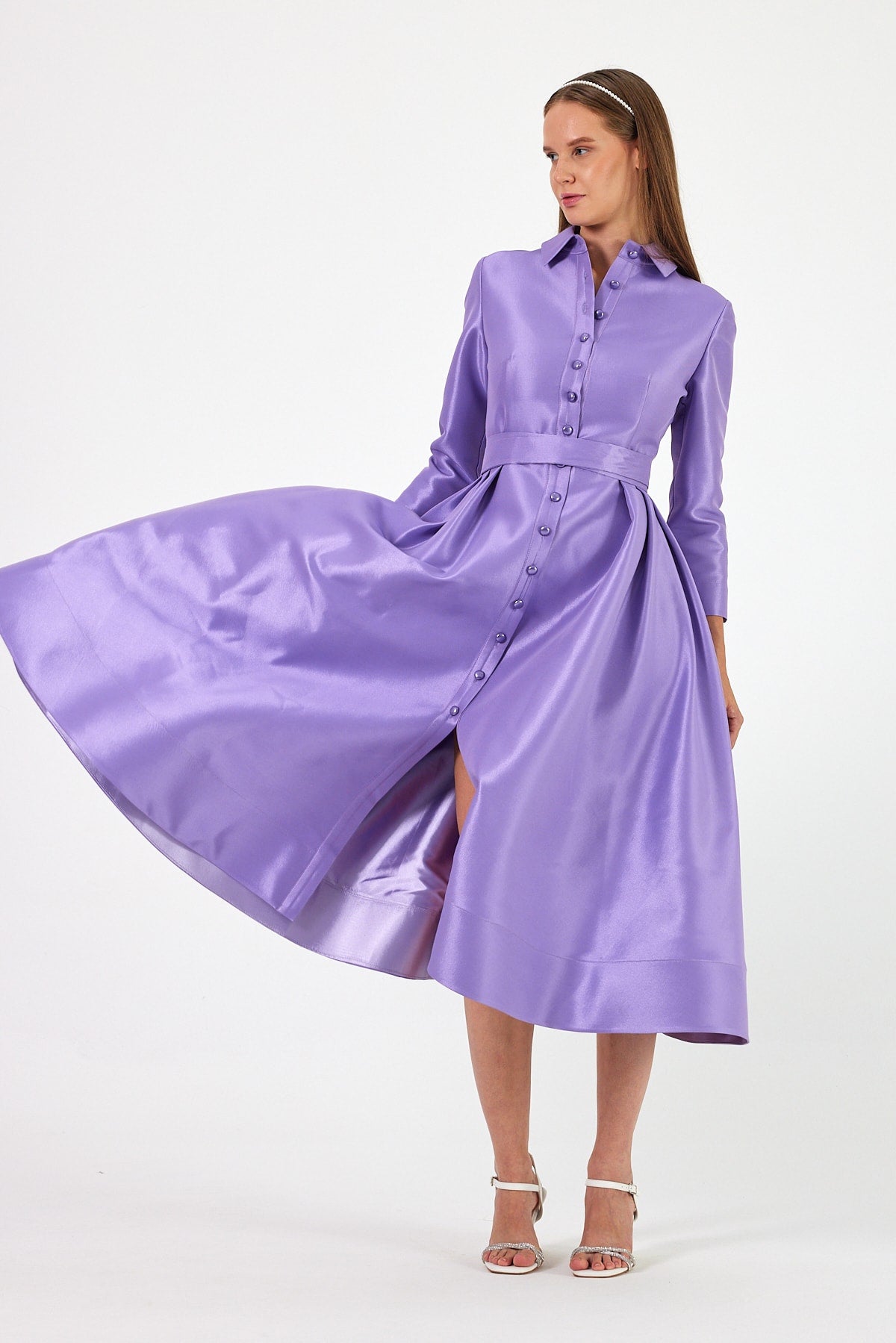 Lila renginin getirdiği ferah ve romantik his, Caden elbisesine farklı bir zarafet kazandırıyor. Kumaşının parlak dokusu, ışığı mükemmel bir şekilde yansıtarak, her adımda ve her ışık altında dikkat çekici bir görüntü oluşturuyor. Bu elbise, özel etkinliklerden davetlere kadar birçok farklı ortamda giyilebilecek çok yönlü bir parça olarak tasarlandı.