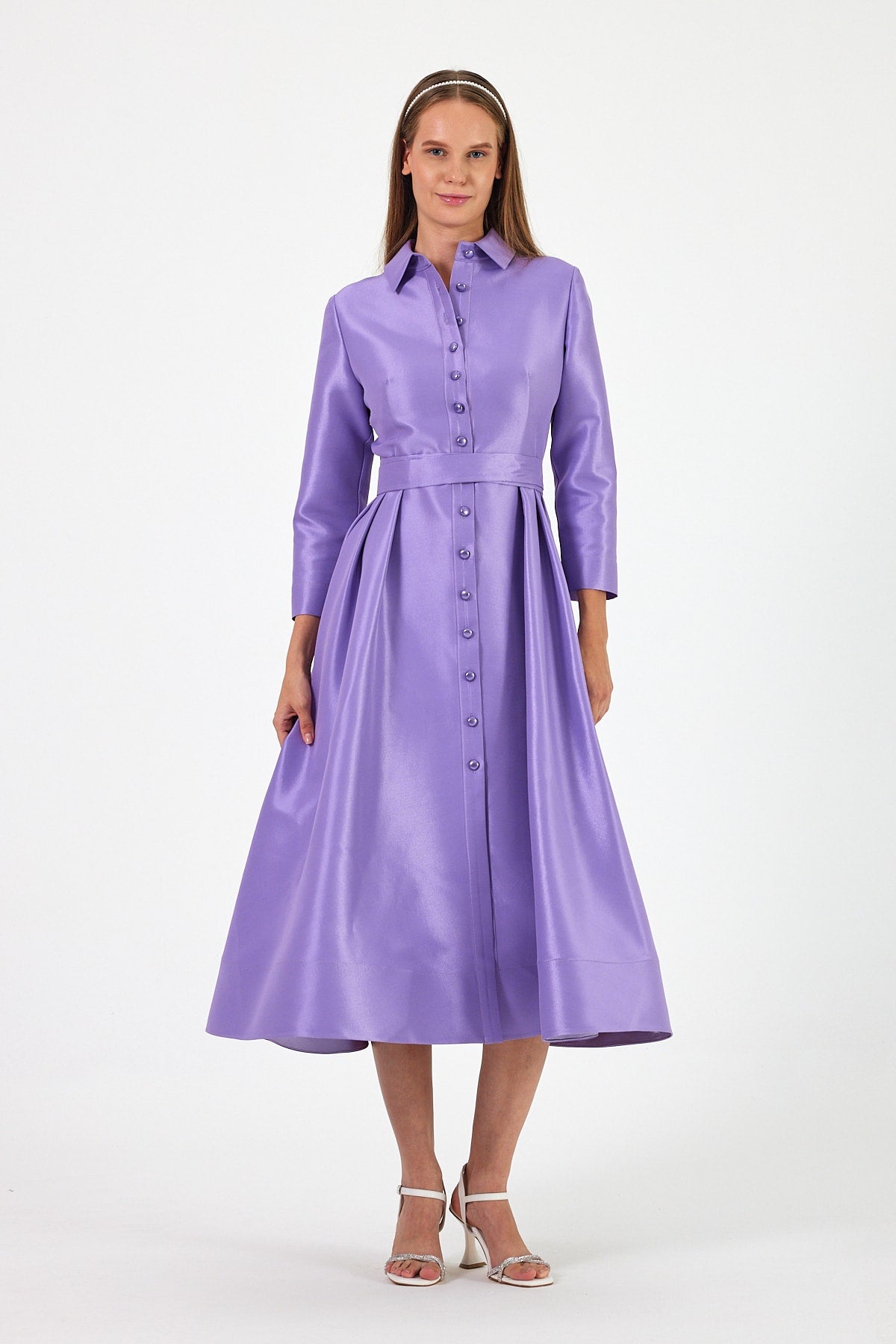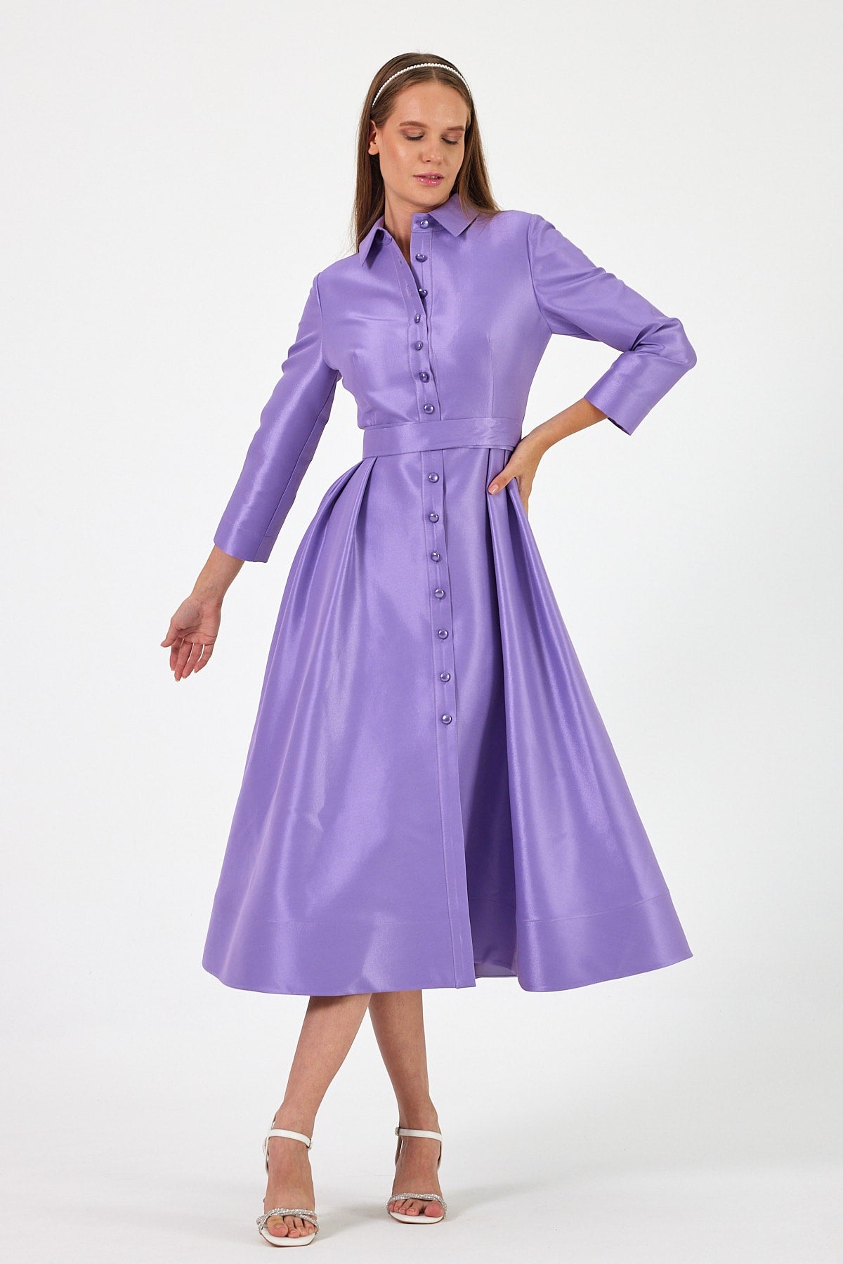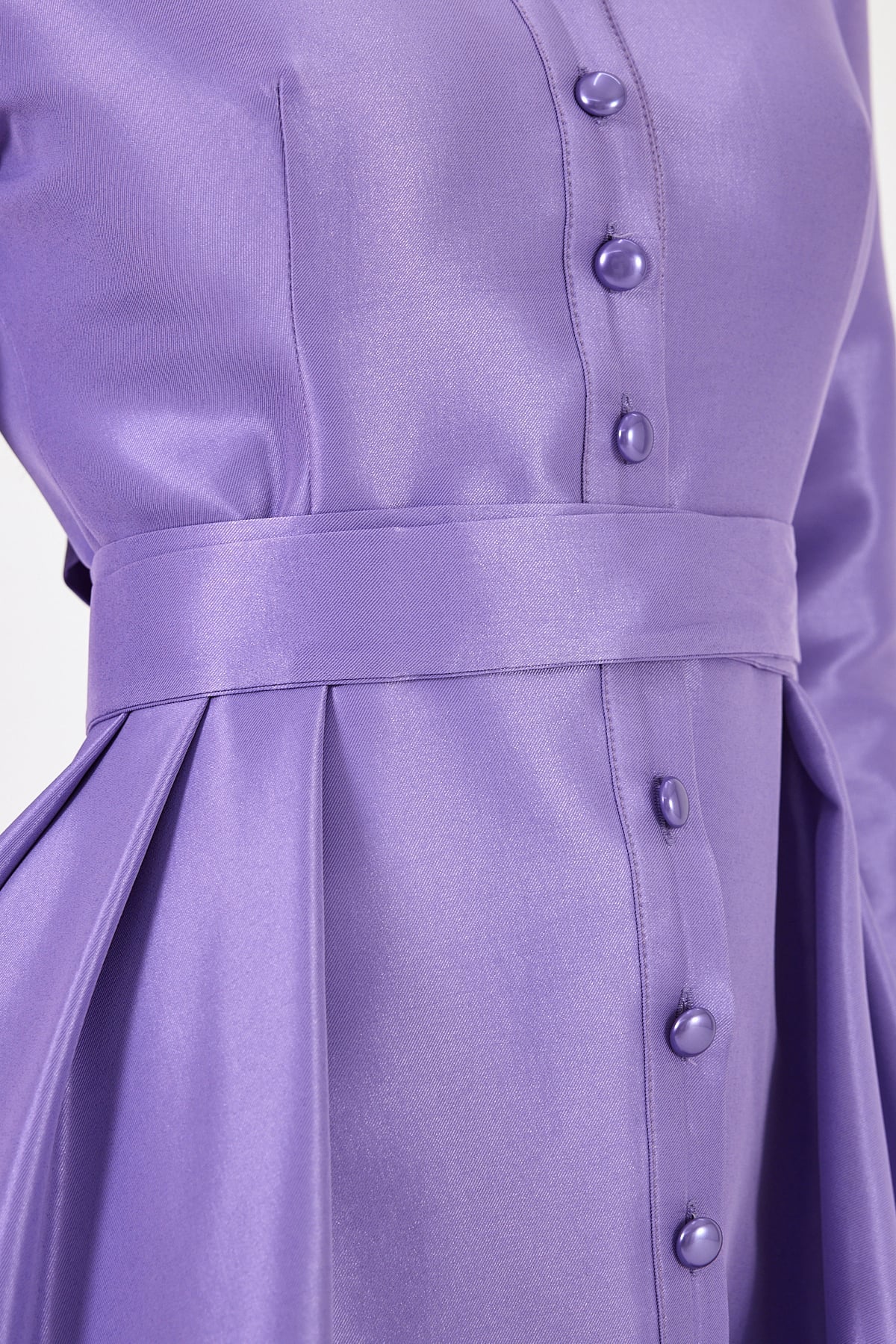 Caden elbisemiz, lila renginin büyüleyici tonuyla zarafeti ve şıklığı bir araya getiriyor. Parlak kumaşı sayesinde göz alıcı bir ışıltıya sahip olan bu elbise, sofistike detaylarıyla öne çıkıyor. Ön kısmındaki inci düğmeler, elbiseye klasik ve zarif bir dokunuş katarak, sade bir şıklık sunuyor. Düğme detayları, hem kullanım kolaylığı sağlarken hem de elbisenin şık ve rafine görünümünü tamamlıyor.