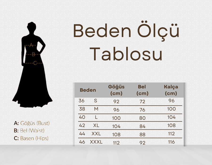 Beden tercihi yaptığınızda, beden tablomuzdaki ölçüleri kabul etmiş sayılırsınız.