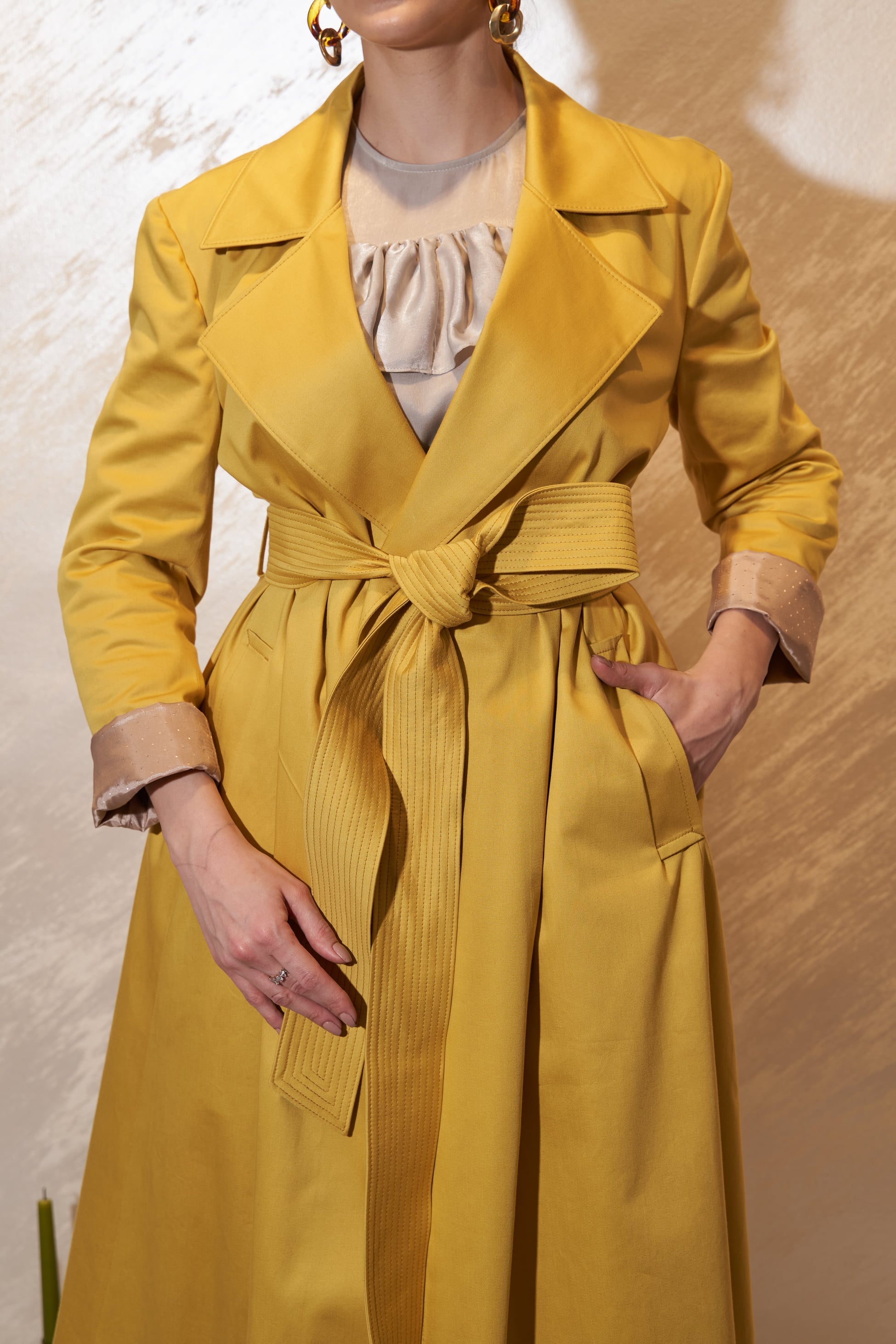 Vintage ve otantik çizgilerin, modern bir hamurla yoğrulup özgün dikişleri ile birleştirilmesinin ardından oluşmuş trençkot modelimiz; bahar ve kış aylarında göz kamaştırıcı renkleri ile zarifliği kucaklıyor. Trençkota vintage hava katan balon kol detayının yanında bulunan bel kuşağı ve geniş yaka detayı ile otantik bir hava eklendi. İlk bakıştan itibaren görenlerin beğenisini kazanacak ve kombinlerinizde özgünlüğü tamamlayacak trençkot modelimiz geçmiş yılların modasının modern bir şekilde bütünleştirerek avangart hale gelmesini sağlıyor.